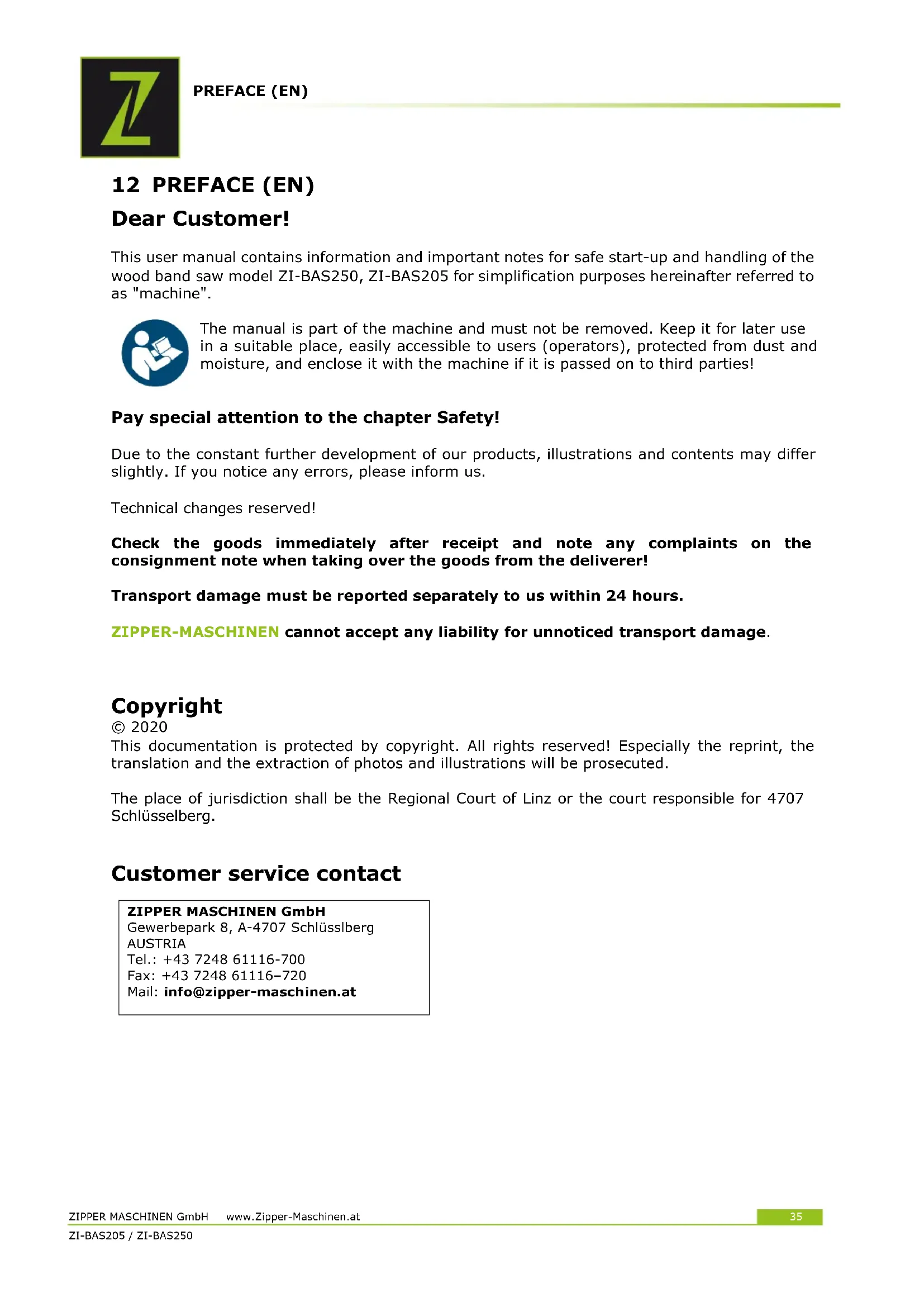 Anweisungen in der Bedienungsanleitung einstellenPREFACE (EN) ZIPPER MASCHINEN GmbH www.Zipper-Maschinen.at 35 ZI-BAS205 / ZI-BAS25035 12 PREFACE (EN) Dear Customer! This user manual contains information and important notes for safe start-up and handling of the wood band saw model ZI-BAS250, ZI-BAS205 for simplification purposes hereinafter referred to as "machine". The manual is part of the machine and must not be removed. Keep it for later use in a suitable place, easily accessible to users (operators), protected from dust and moisture, and enclose it with the machine if it is passed on to third parties!
