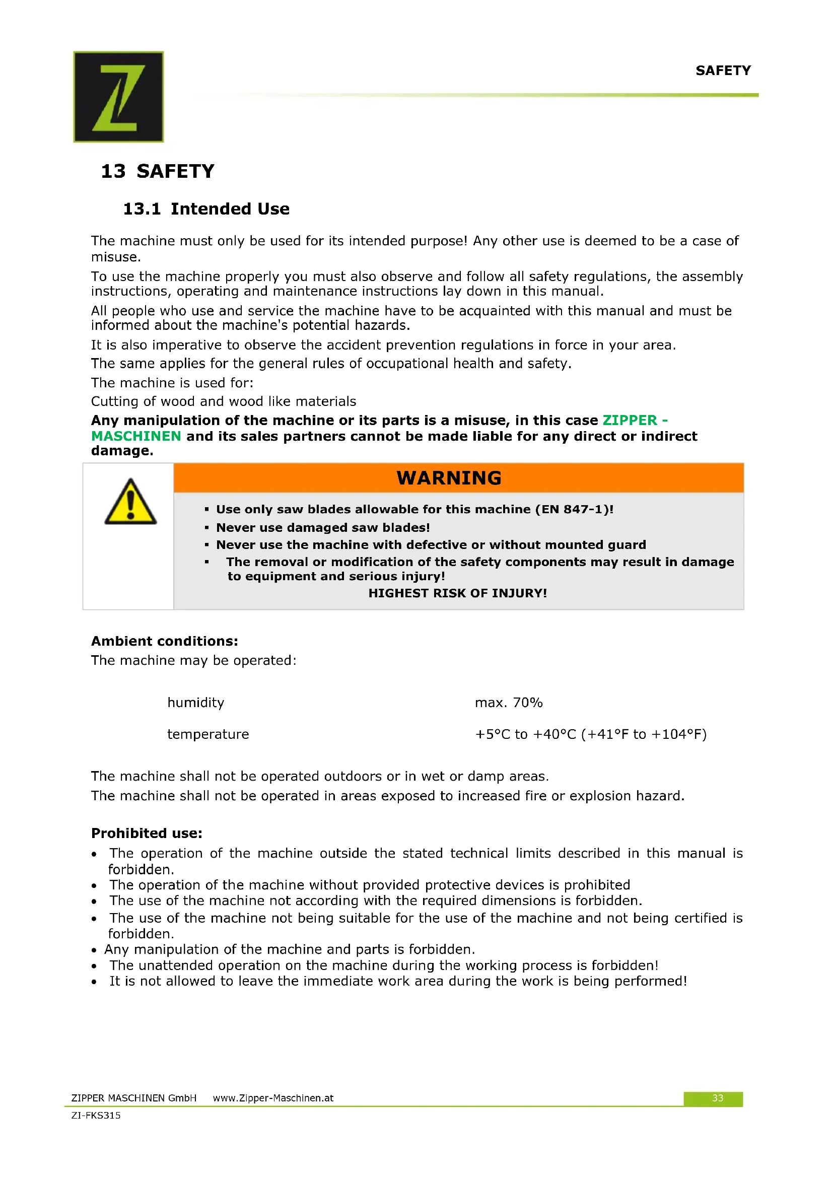 The machine shall not be operated outdoors or in wet or damp areas. The machine shall not be operated in areas exposed to increased fire or explosion hazard. Prohibited use: The operation of the machine outside the stated technical limits described in this manual is forbidden. The operation of the machine without provided protective devices is prohibited The use of the machine not according with the required dimensions is forbidden. The use of the machine not being suitable for the use of the machine and not being certified is forbidden. Any manipulation of the machine and parts is forbidden. The unattended operation on the machine during the working process is forbidden! It is not allowed to leave the immediate work area during the work is being performed!SAFETY ZIPPER MASCHINEN GmbH www.Zipper-Maschinen.at 34 ZI-FKS315