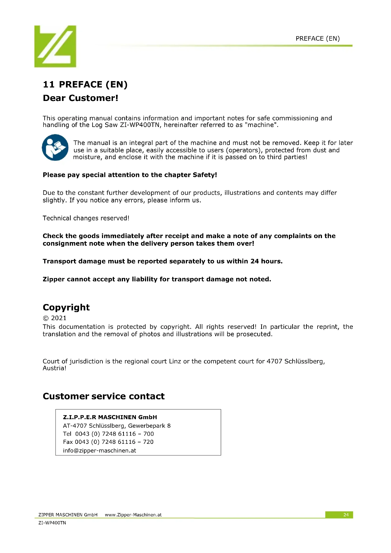 - Sägeblatt tauschenPREFACE (EN) ZIPPER MASCHINEN GmbH www.Zipper-Maschinen.at 24 ZI-WP400TN 11 PREFACE (EN) Dear Customer! This operating manual contains information and important notes for safe commissioning and handling of the Log Saw ZI-WP400TN, hereinafter referred to as "machine". The manual is an integral part of the machine and must not be removed. Keep it for later use in a suitable place, easily accessible to users (operators), protected from dust and moisture, and enclose it with the machine if it is passed on to third parties! Please pay special attention to the chapter Safety! Due to the constant further development of our products, illustrations and contents may differ slightly. If you notice any errors, please inform us. Technical changes reserved! Check the goods immediately after receipt and make a note of any complaints on the consignment note when the delivery person takes them over! Transport damage must be reported separately to us within 24 hours. Zipper cannot accept any liability for transport damage not noted.