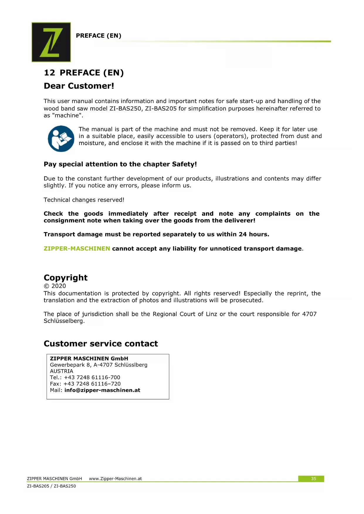 Anweisungen in der Bedienungsanleitung einstellenPREFACE (EN) ZIPPER MASCHINEN GmbH www.Zipper-Maschinen.at 35 ZI-BAS205 / ZI-BAS25035 12 PREFACE (EN) Dear Customer! This user manual contains information and important notes for safe start-up and handling of the wood band saw model ZI-BAS250, ZI-BAS205 for simplification purposes hereinafter referred to as "machine". The manual is part of the machine and must not be removed. Keep it for later use in a suitable place, easily accessible to users (operators), protected from dust and moisture, and enclose it with the machine if it is passed on to third parties!