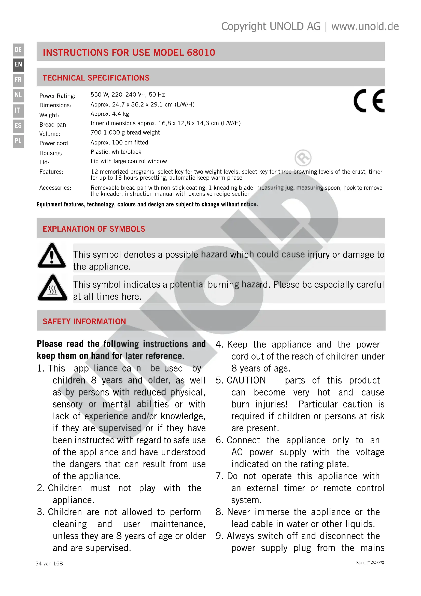 This symbol denotes a possible hazard which could cause injury or damage to the appliance. This symbol indicates a potential burning hazard. Please be especially careful at all times here. Copyright UNOLD AG | www.unold.deStand 21.2.2020 35 von 168