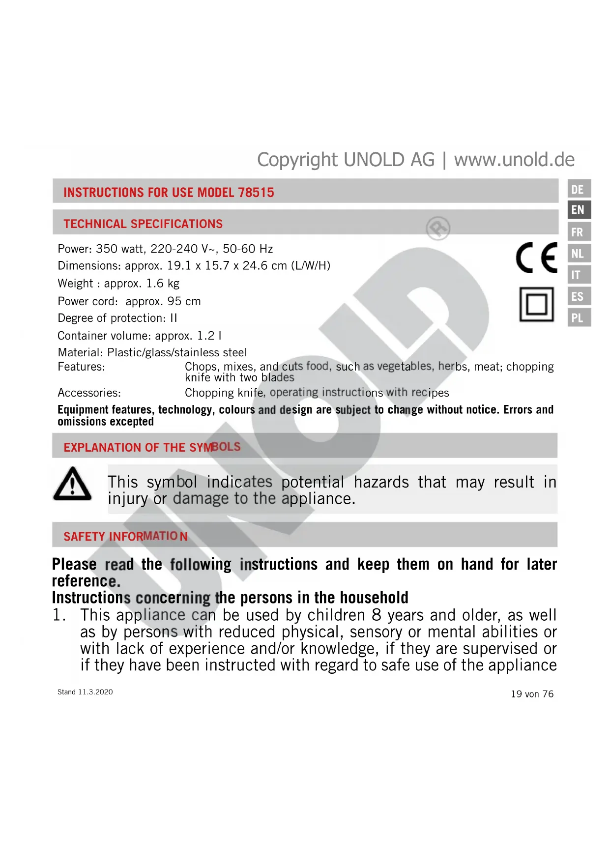 Our appliances are produced on a high quality level for a long lifetime. Regular maintenance and expert repairs by our after-sales service can extend the useful life of the appliance. If an appliance is defective and repair is not possible we ask you to follow the following instructions for disposal. Do not dispose this appliance together with your standard house- hold waste. Please bring this product to an approved collection point for recycling of electric and electronic products. By separate collection and disposal of waste products you help to protect natural resources and ensure, that the product is disposed in an adequate way to protect health and environment. We grant a 24 months guarantee, and in case of commercial use a 12 months guarantee, starting from the date of purchase for any damage demonstrably due to manufacturing defects and when the appliance has been used according to its intended use. Within the warranty period we will remedy defective materials or workmanship through repair or replacement, at our option. Our warranty terms apply only to appliances sold in Germany and Austria. For other countries, please contact the responsible importer. In the event of a claim for remedy of defects, please send the appliance to our after sales service, properly packaged, together with a copy of the automatically generated sales receipt, which must show the date of purchase, and a description of the defect. You can print out a return receipt on our website www.unold.de/ruecksendung. (only for entries from Germany and Austria). The warranty does not cover damage from normal wear, improper handling and failure to comply with the maintenance and care instructions. The warranty is void if repairs or modifica- tions are made to the appliance by third parties. Any claims of the end consumer vis-à-vis the retailer are not limited by this warranty. GUARANTEE CONDITIONS The instruction booklet is also available for download: www.unold.de Copyright UNOLD AG | www.unold.de28 von 76 Stand 11.3.2020