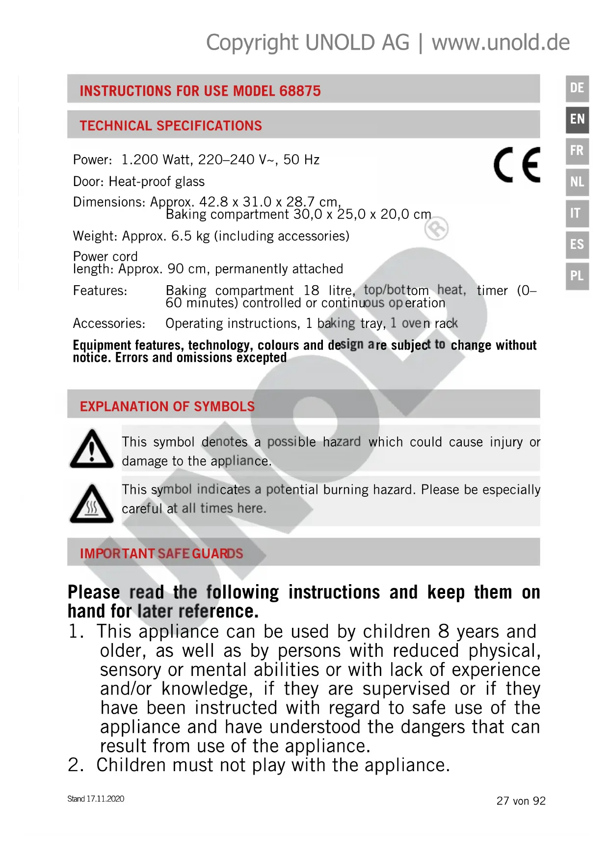 Download the instructions for your Oven in PDF format for free! Find your manual Allround 68875 - UNOLD and take your electronic device back in hand. On this page are published all the documents necessary for the use of your device. Allround 68875 by UNOLD.