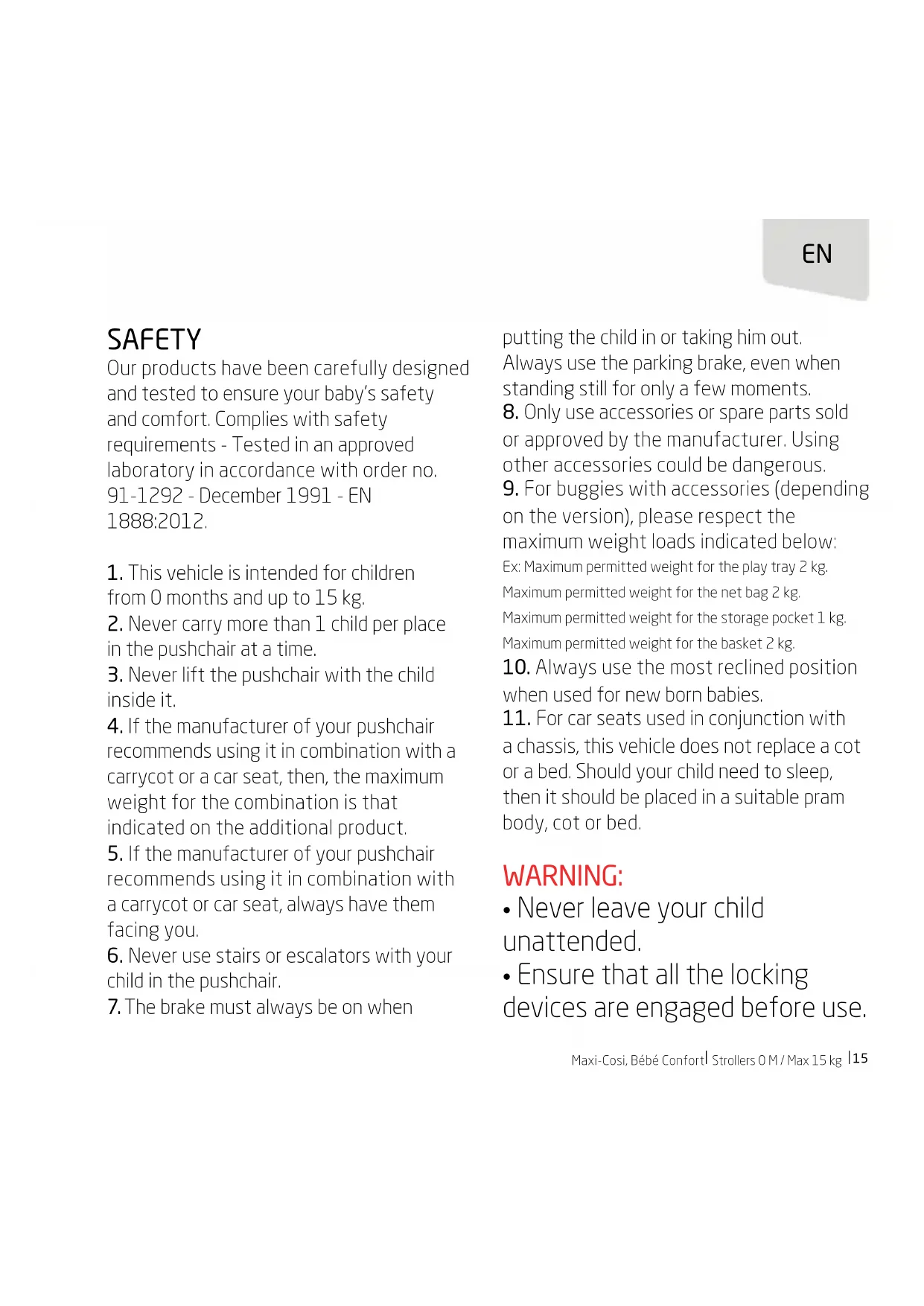 SAFETY Our products have been carefully designed and tested to ensure your baby’s safety and comfort. Complies with safety requirements - Tested in an approved laboratory in accordance with order no. 91-1292 - December 1991 - EN 1888:2012.