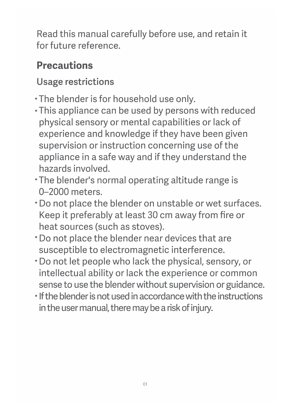 - If the base overheats while operating, turn off the blender for about 20 minutes and wait for it to cool down before resumption.