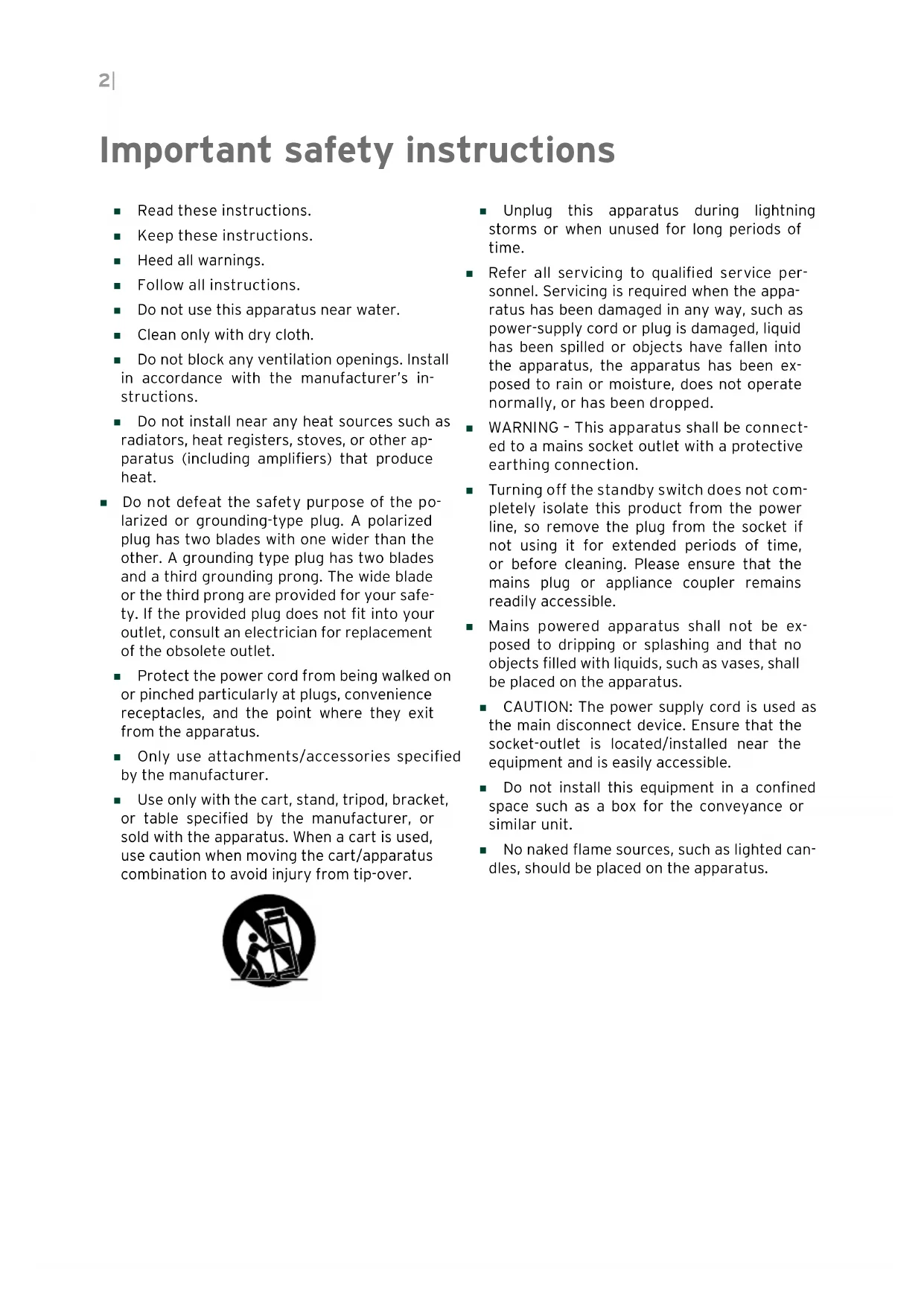 - Turning off the standby switch does not com- pletely isolate this product from the power line, so remove the plug from the socket if not using it for extended periods of time, or before cleaning. Please ensure that the mains plug or appliance coupler remains readily accessible.