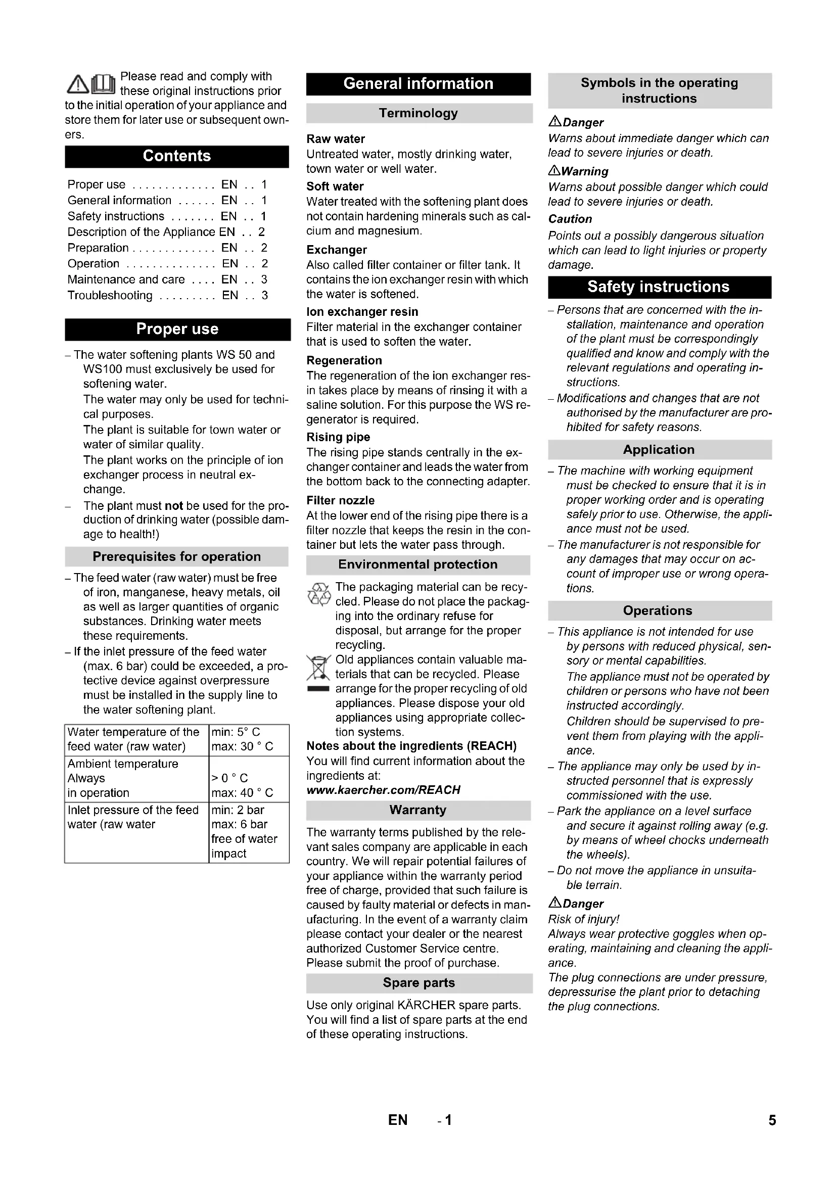 - 5 10,0 20,0 10 5,0 10,0 12 4,2 8,3 14 3,6 7,1 16 3,1 6,3 18 2,8 5,6 20 2,5 5,0 22 2,3 4,5 Messuhr Regeneration Erschöpfte Anlage regenerieren Harzfüllung im Tank ersetzen Pflege und Wartung Allgemeine Hinweise Frostgefahr Tank entleeren bei Frostgefahr Wartungsarbeiten Tägliche Kontrollen vor Betrieb Wartung alle 3 Monaten Störungshilfe Kein Weichwasser Harzaustritt Undichtheit 4 DE- 1 Please read and comply with these original instructions prior to the initial operation of your appliance and store them for later use or subsequent own- ers. – The water softening plants WS 50 and WS100 must exclusively be used for softening water. The water may only be used for techni- cal purposes. The plant is suitable for town water or water of similar quality. The plant works on the principle of ion exchanger process in neutral ex- change. – The plant must not be used for the pro- duction of drinking water (possible dam- age to health!) – The feed water (raw water) must be free of iron, manganese, heavy metals, oil as well as larger quantities of organic substances. Drinking water meets these requirements. – If the inlet pressure of the feed water (max. 6 bar) could be exceeded, a pro- tective device against overpressure must be installed in the supply line to the water softening plant. Untreated water, mostly drinking water, town water or well water. Water treated with the softening plant does not contain hardening minerals such as cal- cium and magnesium. Also called filter container or filter tank. It contains the ion exchanger resin with which the water is softened. Filter material in the exchanger container that is used to soften the water. The regeneration of the ion exchanger res- in takes place by means of rinsing it with a saline solution. For this purpose the WS re- generator is required. The rising pipe stands centrally in the ex- changer container and leads the water from the bottom back to the connecting adapter. At the lower end of the rising pipe there is a filter nozzle that keeps the resin in the con- tainer but lets the water pass through. The packaging material can be recy- cled. Please do not place the packag- ing into the ordinary refuse for disposal, but arrange for the proper recycling. Old appliances contain valuable ma- terials that can be recycled. Please arrange for the proper recycling of old appliances. Please dispose your old appliances using appropriate collec- tion systems. Notes about the ingredients (REACH) You will find current information about the ingredients at: www.kaercher.com/REACH The warranty terms published by the rele- vant sales company are applicable in each country. We will repair potential failures of your appliance within the warranty period free of charge, provided that such failure is caused by faulty material or defects in man- ufacturing. In the event of a warranty claim please contact your dealer or the nearest authorized Customer Service centre. Please submit the proof of purchase. Use only original KÄRCHER spare parts. You will find a list of spare parts at the end of these operating instructions. Danger Warns about immediate danger which can lead to severe injuries or death. 몇 Warning Warns about possible danger which could lead to severe injuries or death. Caution Points out a possibly dangerous situation which can lead to light injuries or property damage. – Persons that are concerned with the in- stallation, maintenance and operation of the plant must be correspondingly qualified and know and comply with the relevant regulations and operating in- structions. – Modifications and changes that are not authorised by the manufacturer are pro- hibited for safety reasons. – The machine with working equipment must be checked to ensure that it is in proper working order and is operating safely prior to use. Otherwise, the appli- ance must not be used. – The manufacturer is not responsible for any damages that may occur on ac- count of improper use or wrong opera- tions. – This appliance is not intended for use by persons with reduced physical, sen- sory or mental capabilities. The appliance must not be operated by children or persons who have not been instructed accordingly. Children should be supervised to pre- vent them from playing with the appli- ance. – The appliance may only be used by in- structed personnel that is expressly commissioned with the use. – Park the appliance on a level surface and secure it against rolling away (e.g. by means of wheel chocks underneath the wheels). – Do not move the appliance in unsuita- ble terrain. Danger Risk of injury! Always wear protective goggles when op- erating, maintaining and cleaning the appli- ance. The plug connections are under pressure, depressurise the plant prior to detaching the plug connections. Contents Proper use