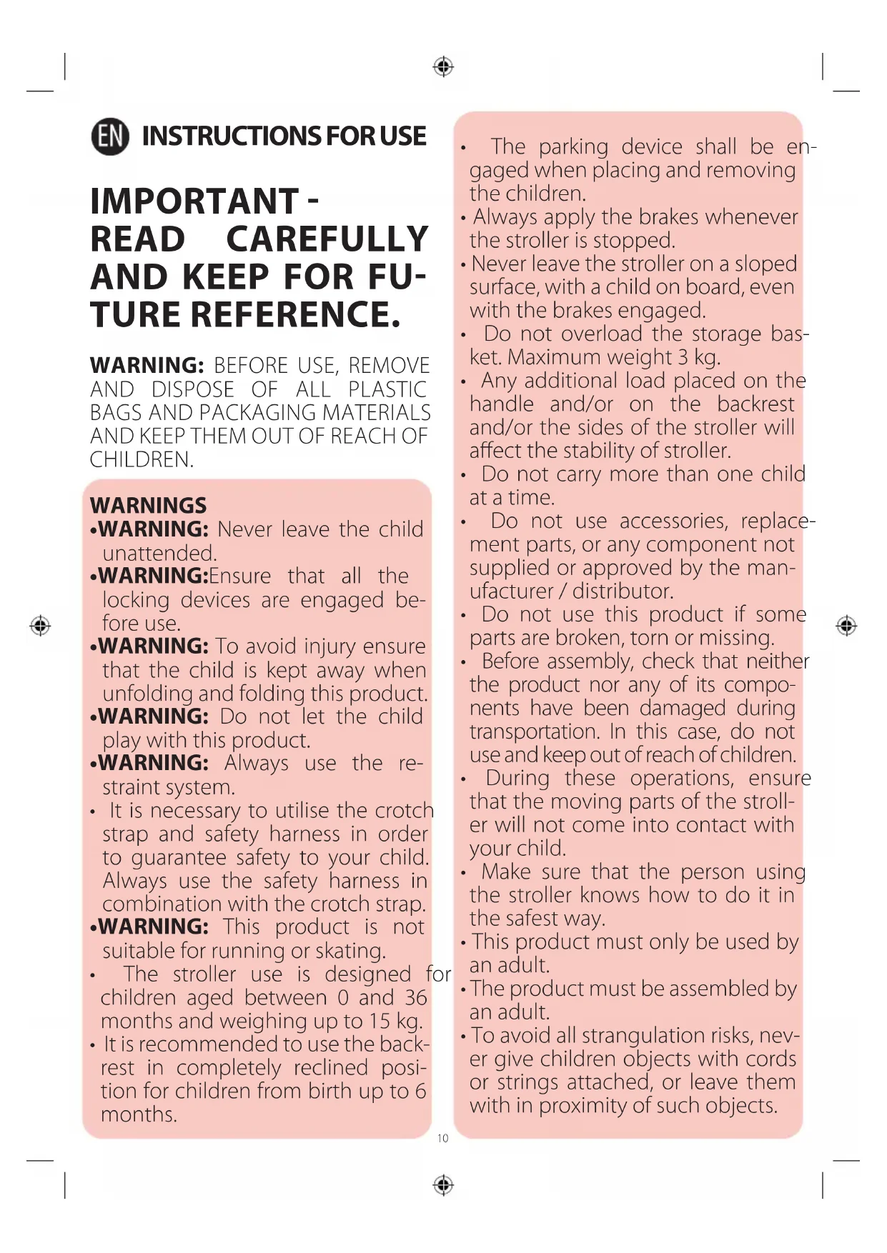 - The stroller use is designed for children aged between 0 and 36 months and weighing up to 15 kg.