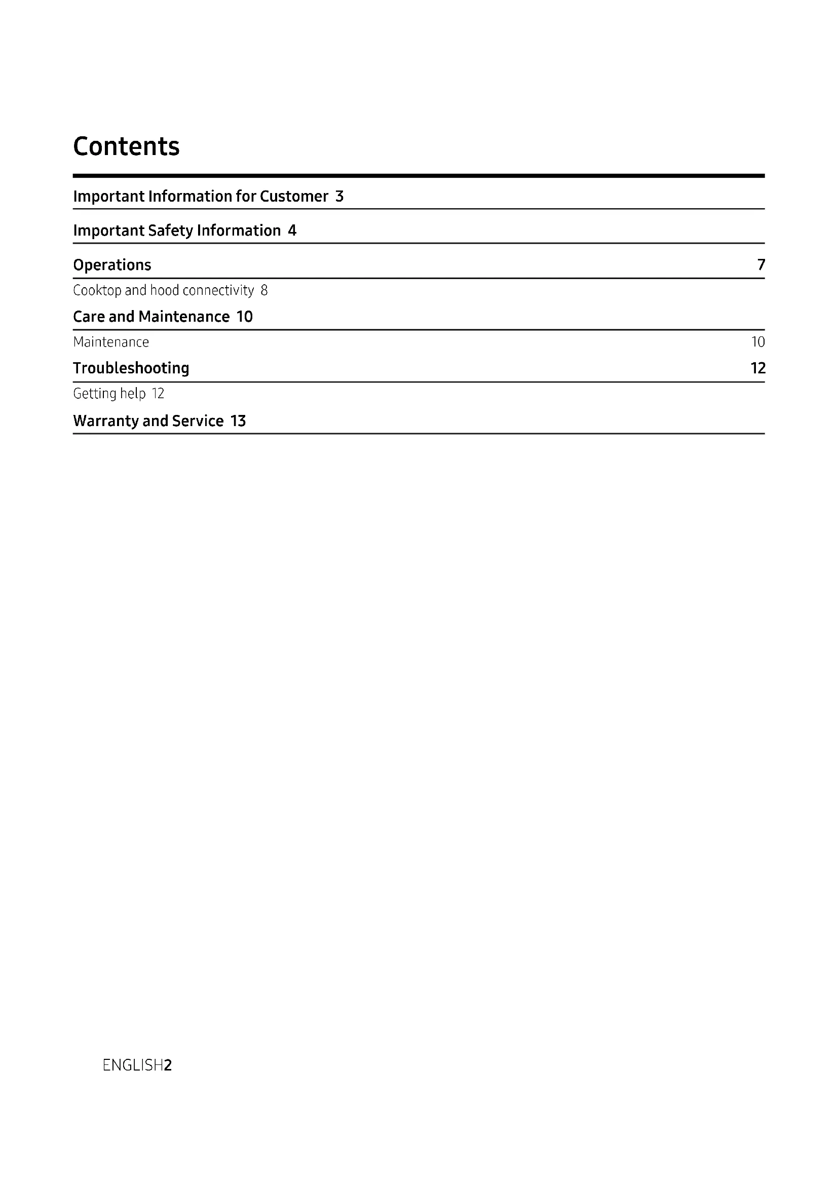 Contents Important Information for Customer 3 Important Safety Information 4 Operations 7 Cooktop and hood connectivity 8 Care and Maintenance 10 Maintenance 10 Troubleshooting 12 Getting help 12 Warranty and Service 13ENGLISH 3 Important Information for Customer Installer Leave these instructions with the owner. Customer Read this manual completely before using your Hood. Save the manual for reference. For service and warranty information, see pg. 13 If you have any questions (other than warranty questions) call Dacor customer service.ENGLISH4 Important Safety Information WARNING This indicates that death or serious injuries may occur as a result of non-observance of this warning. CAUTION This indicates that minor or moderate injuries may occur as a result of non-observance of this warning. NOTE This indicates that damage to the appliance or property may occur as a result of non-observance of this advisory. WARNING Use this unit only in the manner intended by the manufacturer. If you have questions, contact the manufacturer. WARNING