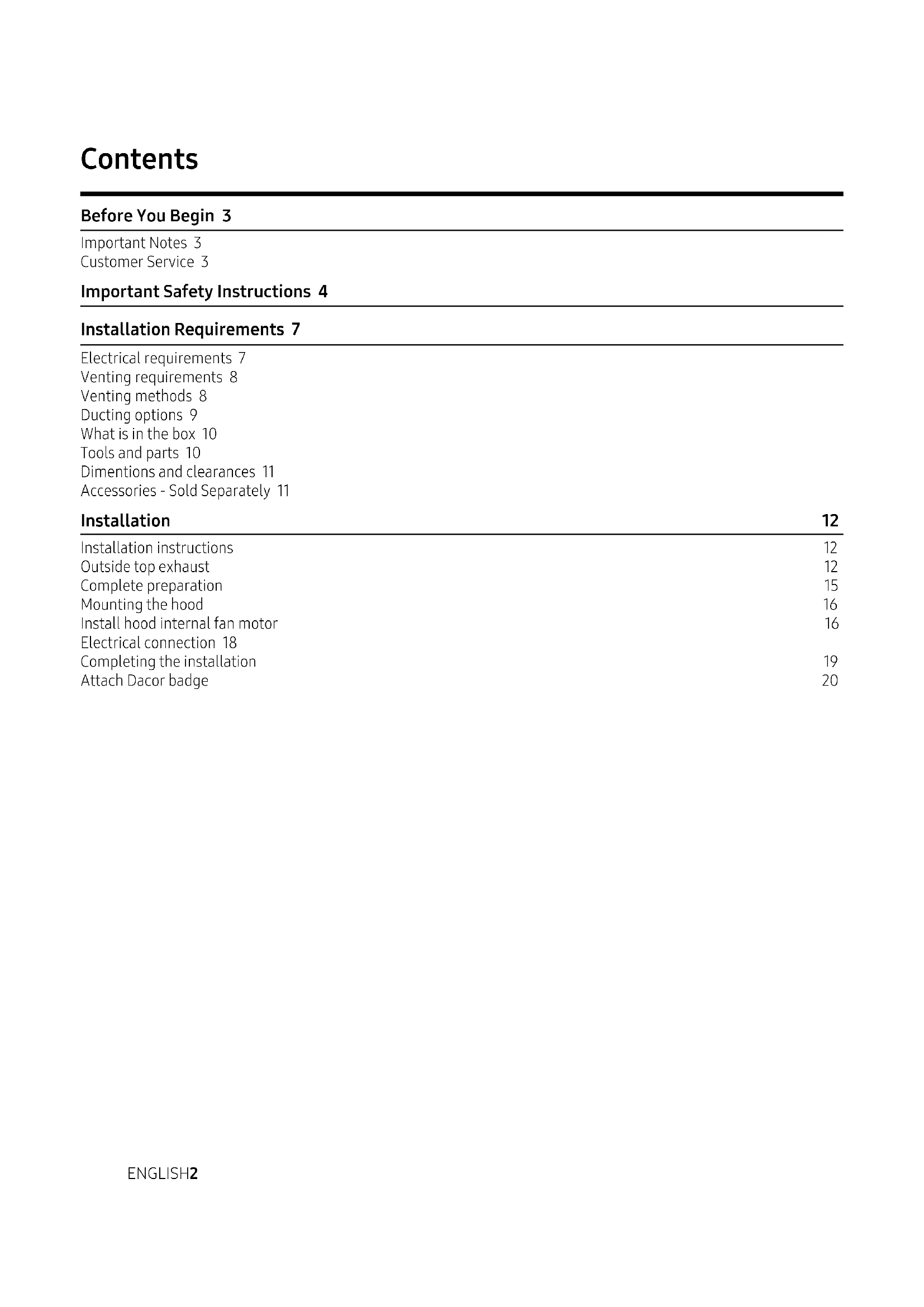 Contents Before You Begin 3 Important Notes 3 Customer Service 3 Important Safety Instructions 4 Installation Requirements 7 Electrical requirements 7 Venting requirements 8 Venting methods 8 Ducting options 9 What is in the box 10 Tools and parts 10 Dimentions and clearances 11 Accessories - Sold Separately 11 Installation 12 Installation instructions 12 Outside top exhaust 12 Complete preparation 15 Mounting the hood 16 Install hood internal fan motor 16 Electrical connection 18 Completing the installation 19 Attach Dacor badge 20ENGLISH 3 Important Notes Installer