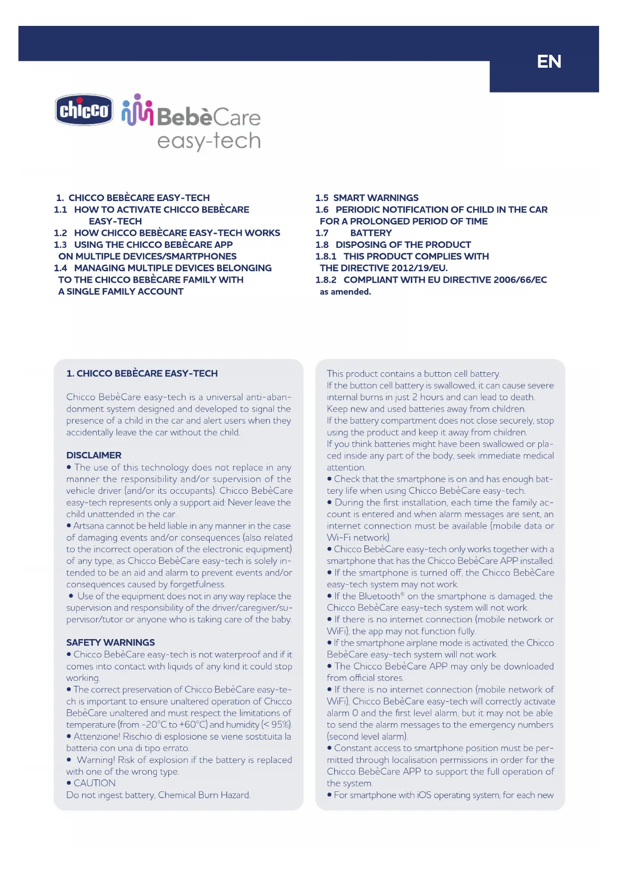 - Artsana cannot be held liable in any manner in the case of damaging events and/or consequences (also related to the incorrect operation of the electronic equipment) of any type, as Chicco BebèCare easy-tech is solely in- tended to be an aid and alarm to prevent events and/or consequences caused by forgetfulness.