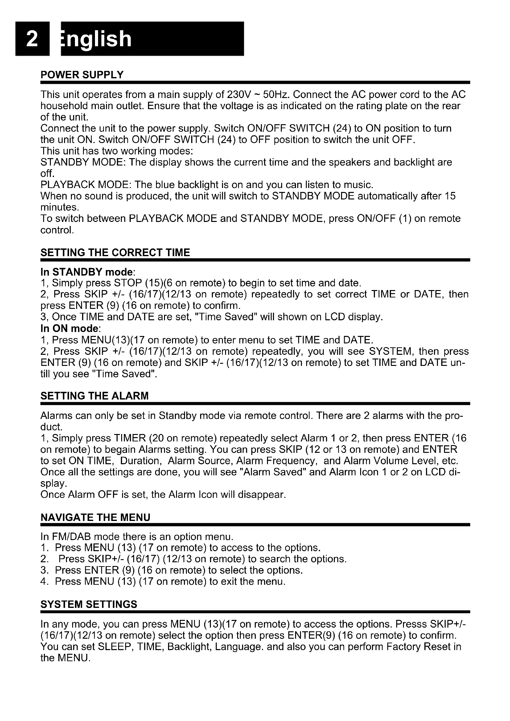 SYSTEM SETTINGS In any mode, you can press MENU (13)(17 on remote) to access the options. Presss SKIP+/- (16/17)(12/13 on remote) select the option then press ENTER(9) (16 on remote) to confirm. You can set SLEEP, TIME, Backlight, Language. and also you can perform Factory Reset in the MENU.3 English DAB MODE Press MODE (8) (5 on remote) repeatedly to select DAB mode. Press SKIP+/- (16/17) (12/13 on remote) to search the program. DAB MENU Press MENU (13) (17 on remote) to access to the options.