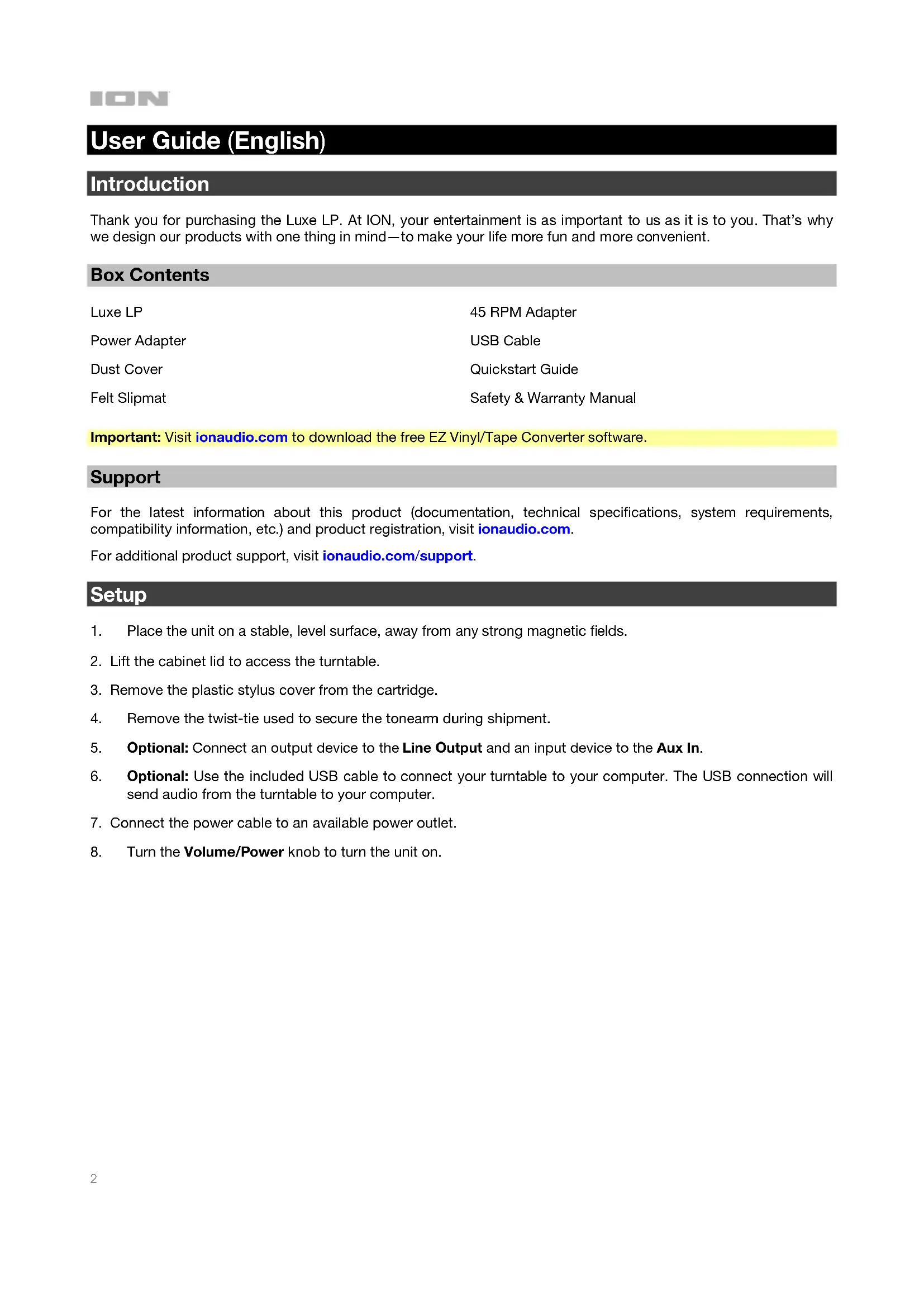 User Guide English ( 2 – 10 ) Guía de usuario Español ( 11 – 19 ) Guide d’utilisation Français ( 20 – 28 ) Guida per l‘uso Italiano ( 29 – 37 ) Benutzerhandbuch Deutsch ( 38 – 46 ) Appendix English ( 47 )2 User Guide (English) Introduction Thank you for purchasing the Luxe LP. At ION, your entertainment is as important to us as it is to you. That’s why we design our products with one thing in mind—to make your life more fun and more convenient. Box Contents Luxe LP Power Adapter Dust Cover Felt Slipmat