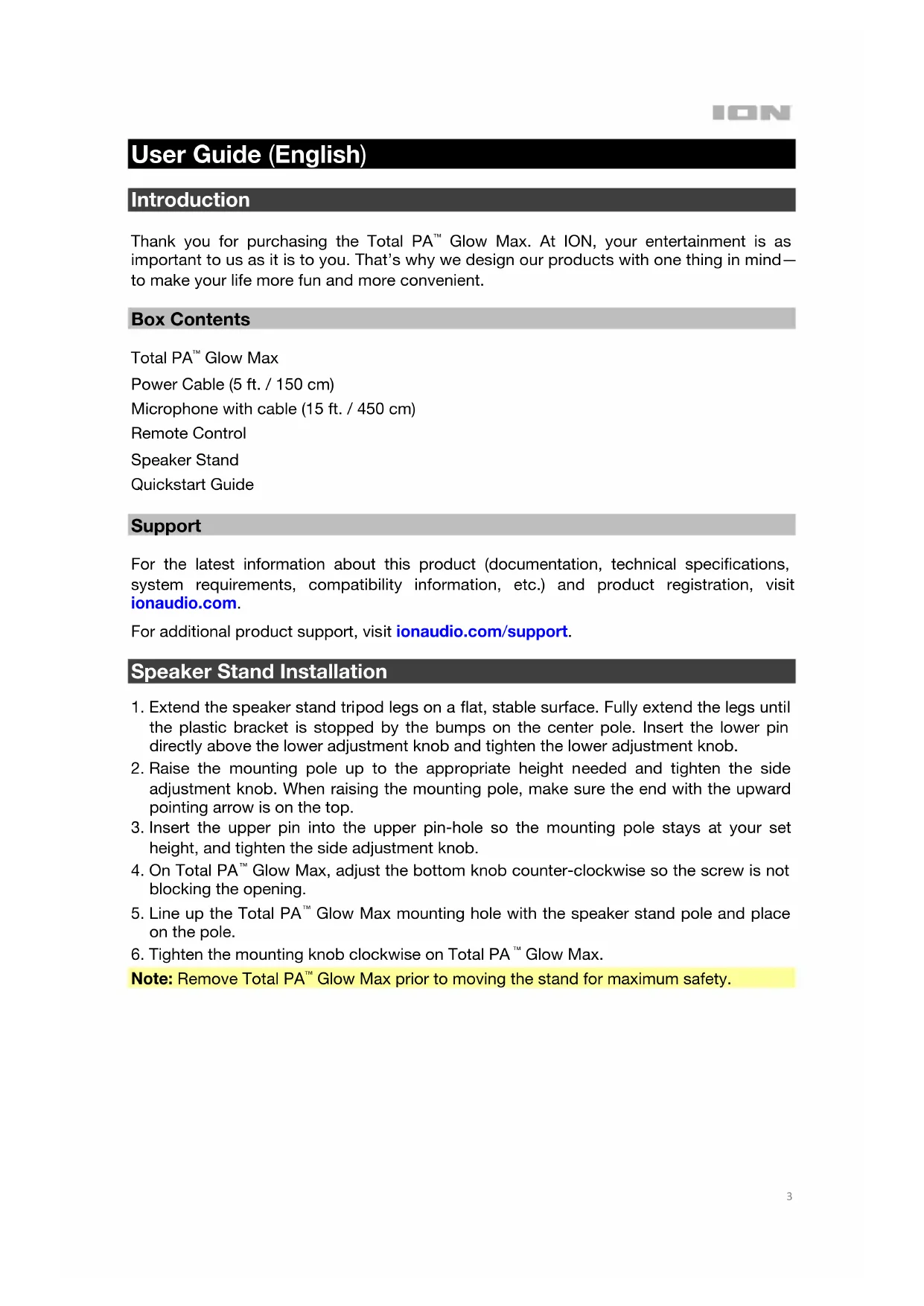 Glow Max Power Cable (5 ft. / 150 cm) Microphone with cable (15 ft. / 450 cm) Remote Control Speaker Stand Quickstart Guide Support For the latest information about this product (documentation, technical specifications, system requirements, compatibility information, etc.) and product registration, visit ionaudio.com. For additional product support, visit ionaudio.com/support. Speaker Stand Installation