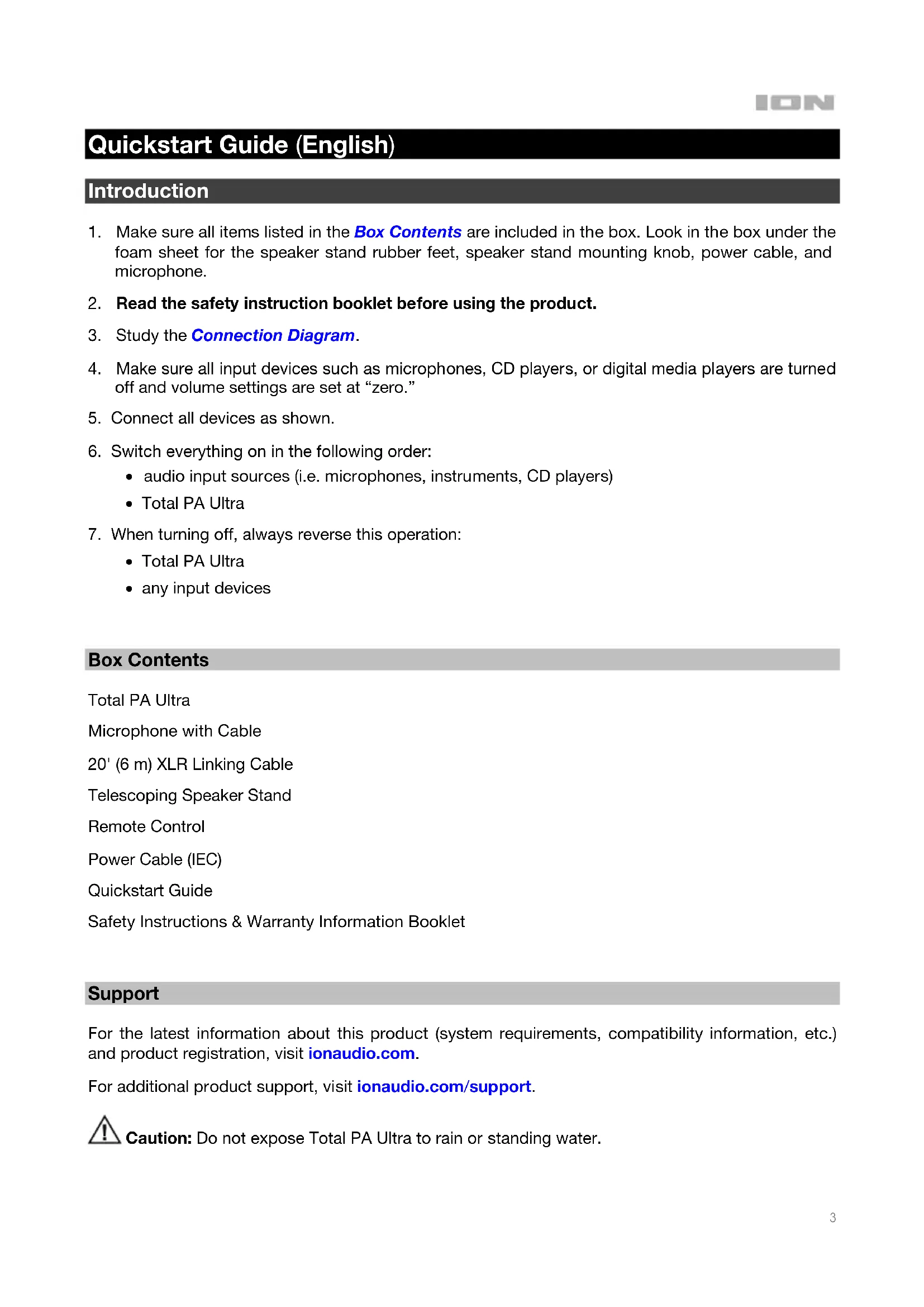 Support For the latest information about this product (system requirements, compatibility information, etc.) and product registration, visit ionaudio.com. For additional product support, visit ionaudio.com/support. Caution: Do not expose Total PA Ultra to rain or standing water.4 Quick Setup Connection Diagram