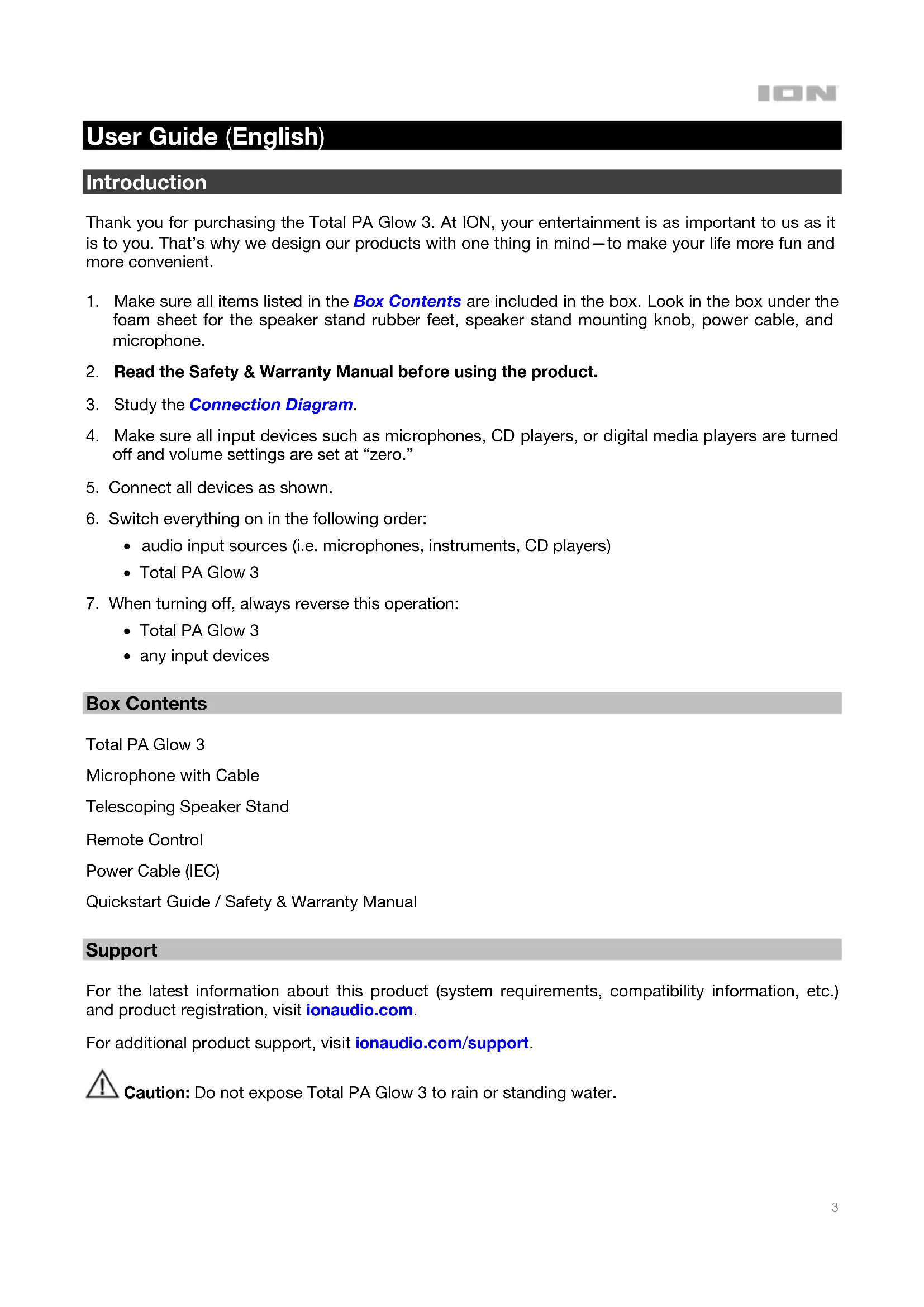 - any input devices Box Contents Total PA Glow 3 Microphone with Cable Telescoping Speaker Stand Remote Control Power Cable (IEC) Quickstart Guide / Safety & Warranty Manual Support For the latest information about this product (system requirements, compatibility information, etc.) and product registration, visit ionaudio.com. For additional product support, visit ionaudio.com/support. Caution: Do not expose Total PA Glow 3 to rain or standing water.4