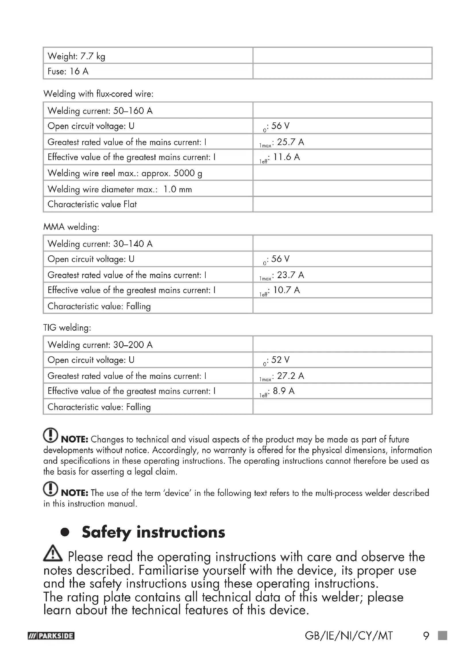 : 52 V Greatest rated value of the mains current: I 1max : 27.2 A Effective value of the greatest mains current: I 1eff : 8.9 A Characteristic value: Falling NOTE: Changes to technical and visual aspects of the product may be made as part of future developments without notice. Accordingly, no warranty is offered for the physical dimensions, information and specifications in these operating instructions. The operating instructions cannot therefore be used as the basis for asserting a legal claim. NOTE: The use of the term ‘device’ in the following text refers to the multi-process welder described in this instruction manual. z Safety instructions Please read the operating instructions with care and observe the notes described. Familiarise yourself with the device, its proper use and the safety instructions using these operating instructions. The rating plate contains all technical data of this welder; please learn about the technical features of this device.10 GB/IE/NI/CY/MT Keep the packaging material away from small children. There is a risk of suffocation! Repairs or/and maintenance work must only be carried out by qualified electricians. This device may be used by children aged 16 years and older, and by persons with reduced physical, sensory or mental capacities, or a lack of experience and knowledge, if they are supervised or have been instructed in how to use the device safely and understand the dangers that may arise when using it. Do not allow children to play with the device. Cleaning and day-to-day mainte- nance must not be performed by children without supervision. Repairs or/and maintenance work must only be carried out by qualified electricians. Only use the welding cables provided in the scope of delivery. During operation, the device should not be positioned directly against the wall, should not be covered or jammed between other devices so that sufficient air can always be absorbed through the ventilation slats. Make sure that the device is correctly connected to the mains voltage. Avoid any form of tensile stress of the power cable. Disconnect the plug from the socket prior to setting up the device in another location. If the device is not in operation, always switch it off by pressing the ON/OFF switch. Place the electrode holder on an insulated surface and only remove the electrodes from the holder after allowing it to cool down for 15 minutes. Pay attention to the condition of the welding cable, electrode holder and the earth terminals. Wear and tear of the insulation and the live parts can lead to hazards and reduce the quality of the welding work. Arc welding creates sparks, molten metal parts and smoke. Therefore ensure that: All flammable substances and/or materials are removed from the work station and its immediate surrounding. Ensure the work station is ventilated. Do not weld on containers, vessels or tubes that contain or contained flammable liquids or gases. Avoid any form of direct contact with the welding current circuit. The no-load voltage between the electrode holder and earth terminal can be dangerous, there is a risk of electric shock. Do not store the device in a damp or wet environment or in theGB/IE/NI/CY/MT
