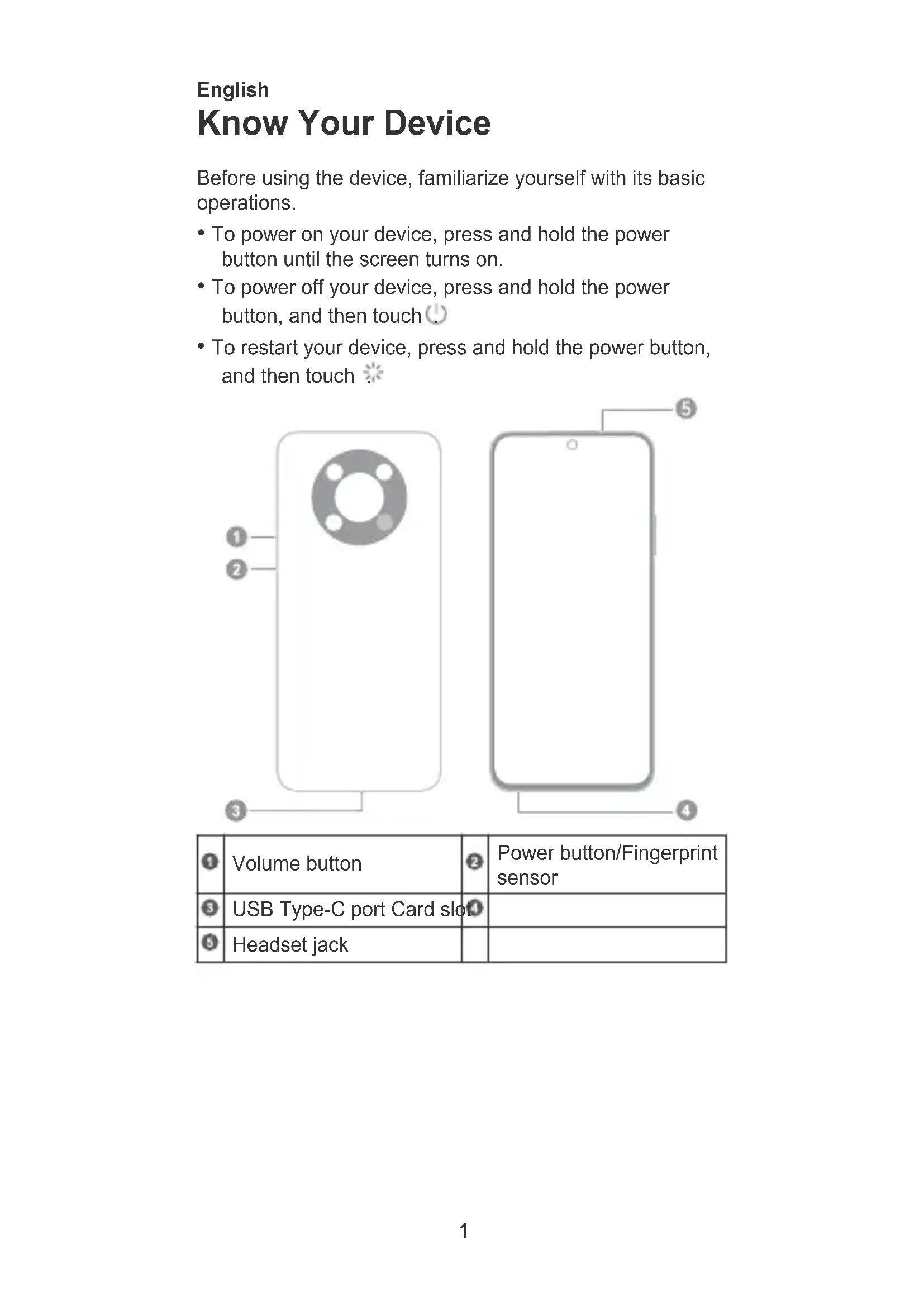 - To restart your device, press and hold the power button, and then touch . Volume button Power button/Fingerprint sensor USB Type-C port Card slot Headset jack 1Getting Started