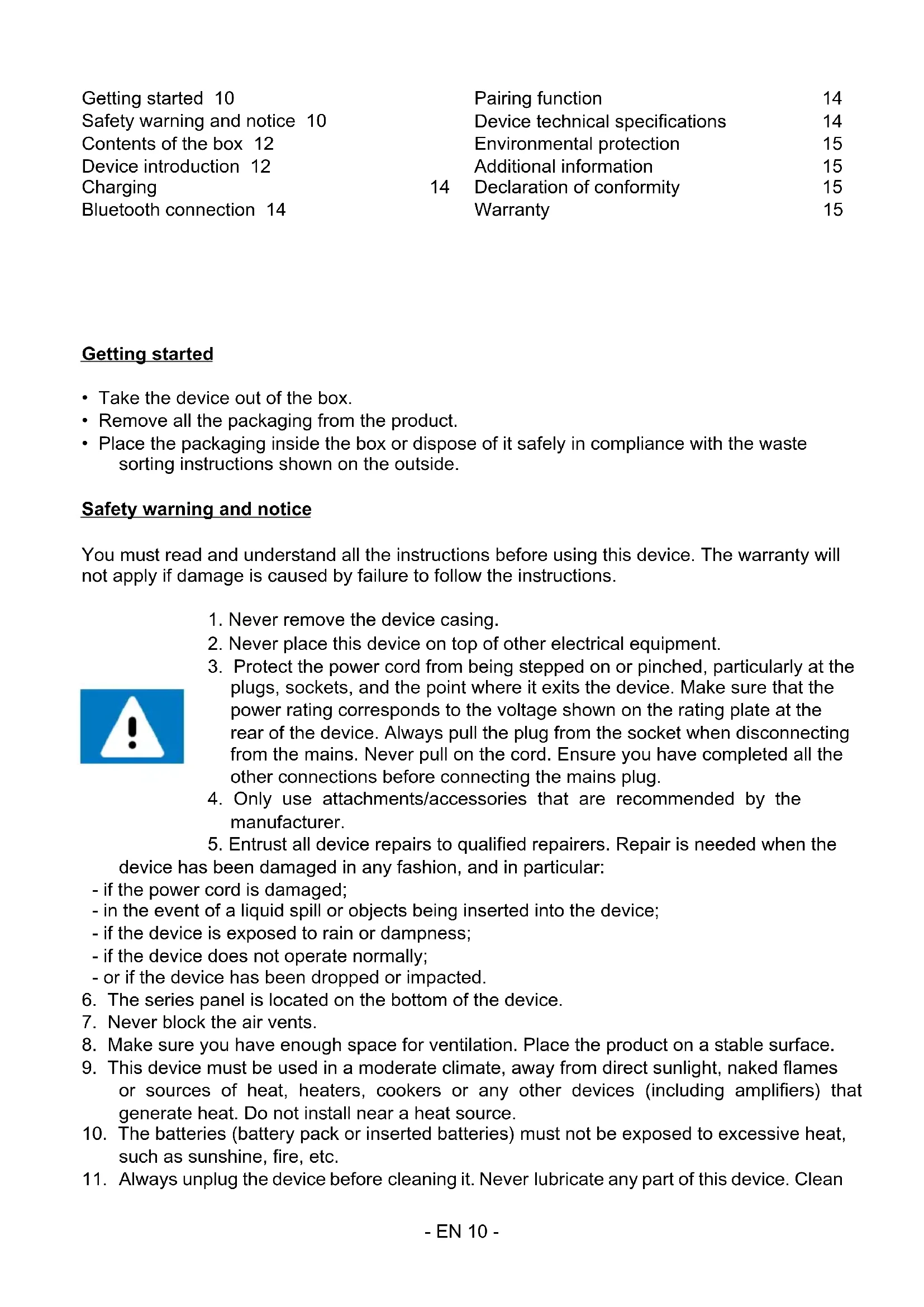 Getting started 10 Safety warning and notice 10 Contents of the box 12 Device introduction 12 Charging 14 Bluetooth connection 14 Pairing function 14 Device technical specications 14 Environmental protection 15 Additional information 15 Declaration of conformity 15 Warranty 15- EN 11 - it with a soft cloth. Do not use abrasive products or harsh cleaners.