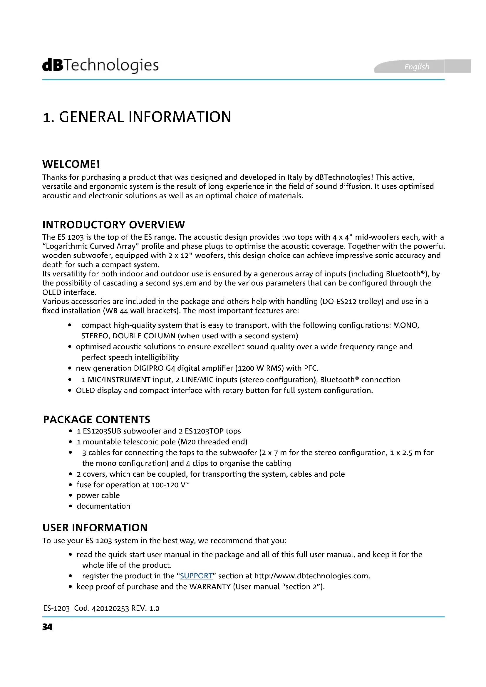 WELCOME! INTRODUCTORY OVERVIEW USER INFORMATION Thanks for purchasing a product that was designed and developed in Italy by dBTechnologies! This active, versatile and ergonomic system is the result of long experience in the eld of sound diffusion. It uses optimised acoustic and electronic solutions as well as an optimal choice of materials. The ES 1203 is the top of the ES range. The acoustic design provides two tops with 4 x 4" mid-woofers each, with a “Logarithmic Curved Array” prole and phase plugs to optimise the acoustic coverage. Together with the powerful wooden subwoofer, equipped with 2 x 12" woofers, this design choice can achieve impressive sonic accuracy and depth for such a compact system. Its versatility for both indoor and outdoor use is ensured by a generous array of inputs (including Bluetooth®), by the possibility of cascading a second system and by the various parameters that can be congured through the OLED interface. Various accessories are included in the package and others help with handling (DO-ES212 trolley) and use in a xed installation (WB-44 wall brackets). The most important features are: To use your ES-1203 system in the best way, we recommend that you: