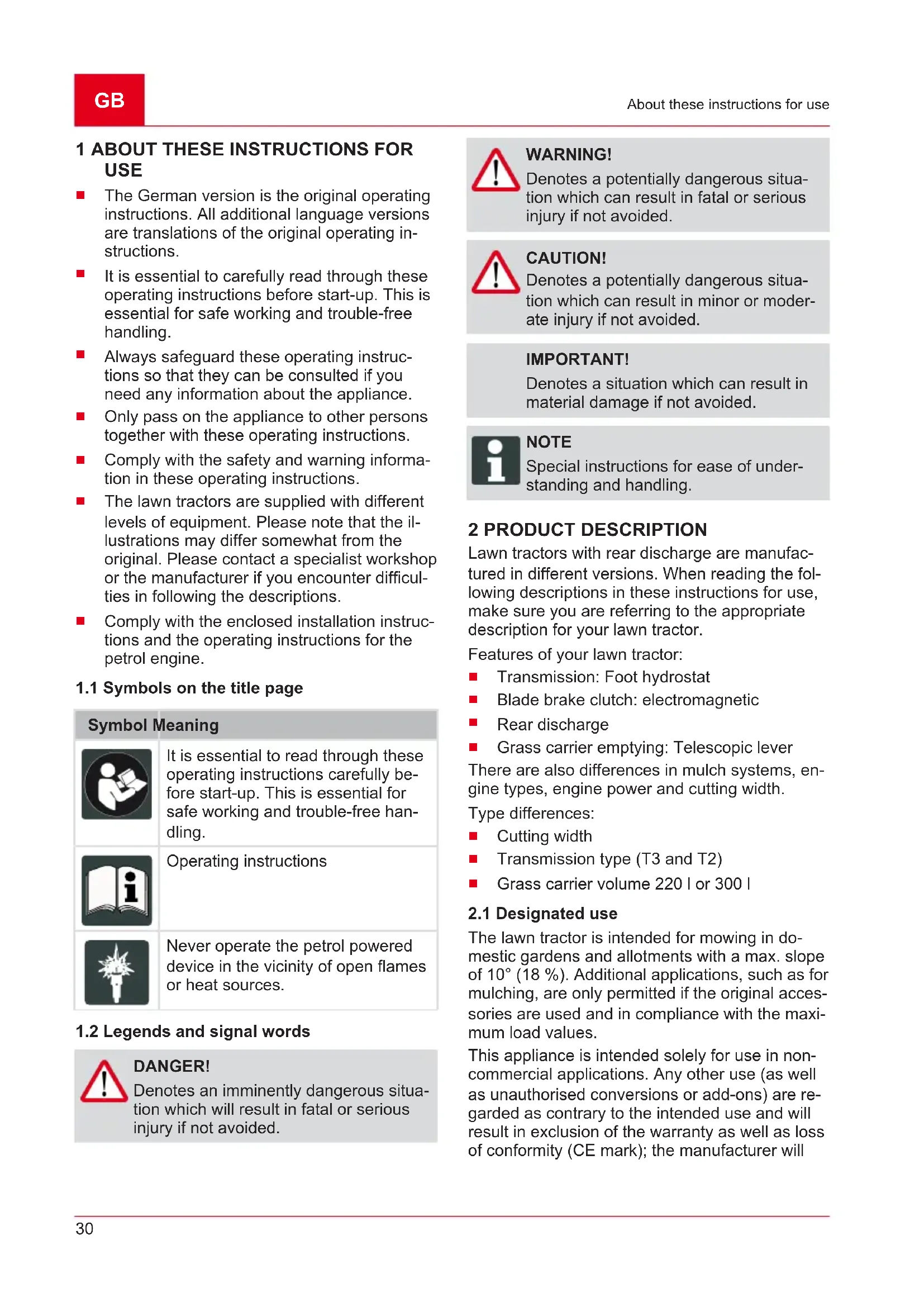 DANGER! Denotes an imminently dangerous situa- tion which will result in fatal or serious injury if not avoided. WARNING! Denotes a potentially dangerous situa- tion which can result in fatal or serious injury if not avoided. CAUTION! Denotes a potentially dangerous situa- tion which can result in minor or moder- ate injury if not avoided. IMPORTANT! Denotes a situation which can result in material damage if not avoided. NOTE Special instructions for ease of under- standing and handling. 2 PRODUCT DESCRIPTION Lawn tractors with rear discharge are manufac- tured in different versions. When reading the fol- lowing descriptions in these instructions for use, make sure you are referring to the appropriate description for your lawn tractor. Features of your lawn tractor: