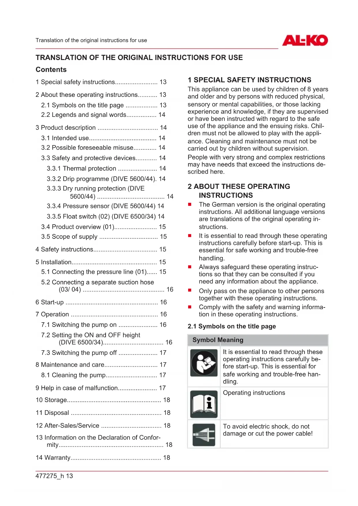 Faults in the electrical system must be recti- fied by a qualified electrician. NOTE In the event of faults that you cannot rectify, please contact our Customer Service de- partment. Malfunction Possible cause Remedy Engine does not start. Impeller blocked. Remove dirt from the suction area. Clean with a suitable tool through the opening on the bottom of the motor housing and turn the im- peller to clear the blockage. Thermal pro- tection switch has switched off. Wait until the thermal protec- tion switch on the pump switches on again. Take note of the max- imum tempera- ture of the con- veying medium. Have the pump inspected. No mains power. Check the fus- es, have the power supply checked by a qualified electri- cian. Float switch does not trip when the wa- ter level rises. Send the pump to an AL-KO service facility. Dry running protection ac- tivated Check the suc- tion side. Drip pro- gramme acti- vated Check the suc- tion side. Unplug the mains cable and plug in again.GB 18 DIVE 5600/44 | DIVE 6500/34 Storage Malfunction Possible cause Remedy Pump run- ning but does not feed. Air in pump housing. Vent the pump by holding it at an angle. Blockage on the suction side. Remove dirt from the suction area. Pressure line closed off. Open the pres- sure lone. Pressure hose kinked. Extend the pres- sure hose. Dry running protection ac- tivated Check the suc- tion side. Delivery rate too low Hose diame- ter too small. Use a hose with a bigger diame- ter. Blockage on the suction side. Remove dirt from the suction area. Feed head too high. Observe the max. feed head, see technical data. Separate suc- tion hose too long. Observe the max. feed head, see technical data. 10 STORAGE NOTE If there is the danger of frost, the sys- tem must be completely drained and the pump must be stored in a frost-proof place. 11 DISPOSAL Electrical and electronic appliances do not belong in household waste, but should be collected and disposed of separately. Packaging, equipment and accessories are made from recyclable materials, and must be disposed of accordingly. 12 AFTER-SALES/SERVICE In the event of questions of warranty, repair or spare parts, please contact your nearest AL- KOService Centre. These can be found on the Internet at: www.alko-garden.com/service-contacts Further information on spare parts can be found at: www.alko-garden.com/spareparts