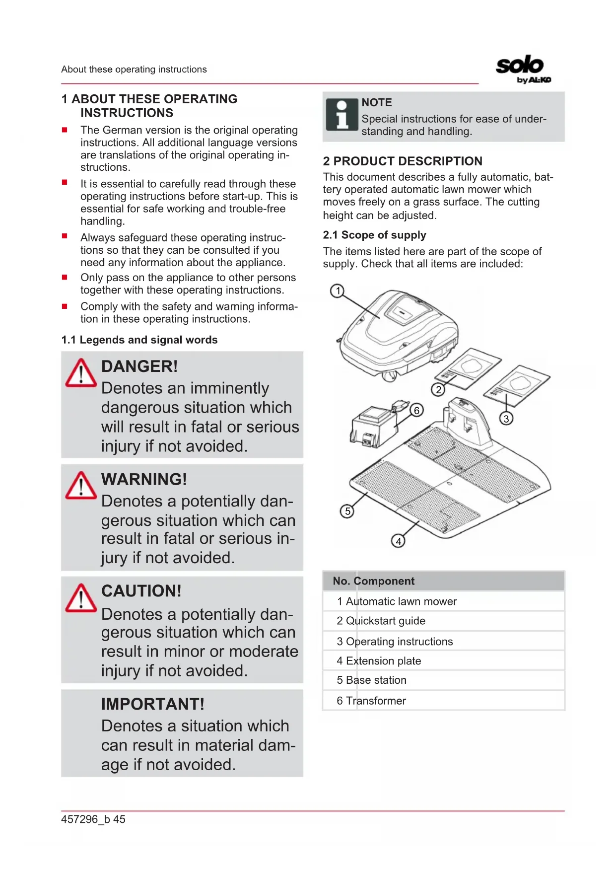 DANGER! Denotes an imminently dangerous situation which will result in fatal or serious injury if not avoided. WARNING! Denotes a potentially dan- gerous situation which can result in fatal or serious in- jury if not avoided. CAUTION! Denotes a potentially dan- gerous situation which can result in minor or moderate injury if not avoided. IMPORTANT! Denotes a situation which can result in material dam- age if not avoided. NOTE Special instructions for ease of under- standing and handling. 2 PRODUCT DESCRIPTION This document describes a fully automatic, bat- tery operated automatic lawn mower which moves freely on a grass surface. The cutting height can be adjusted.