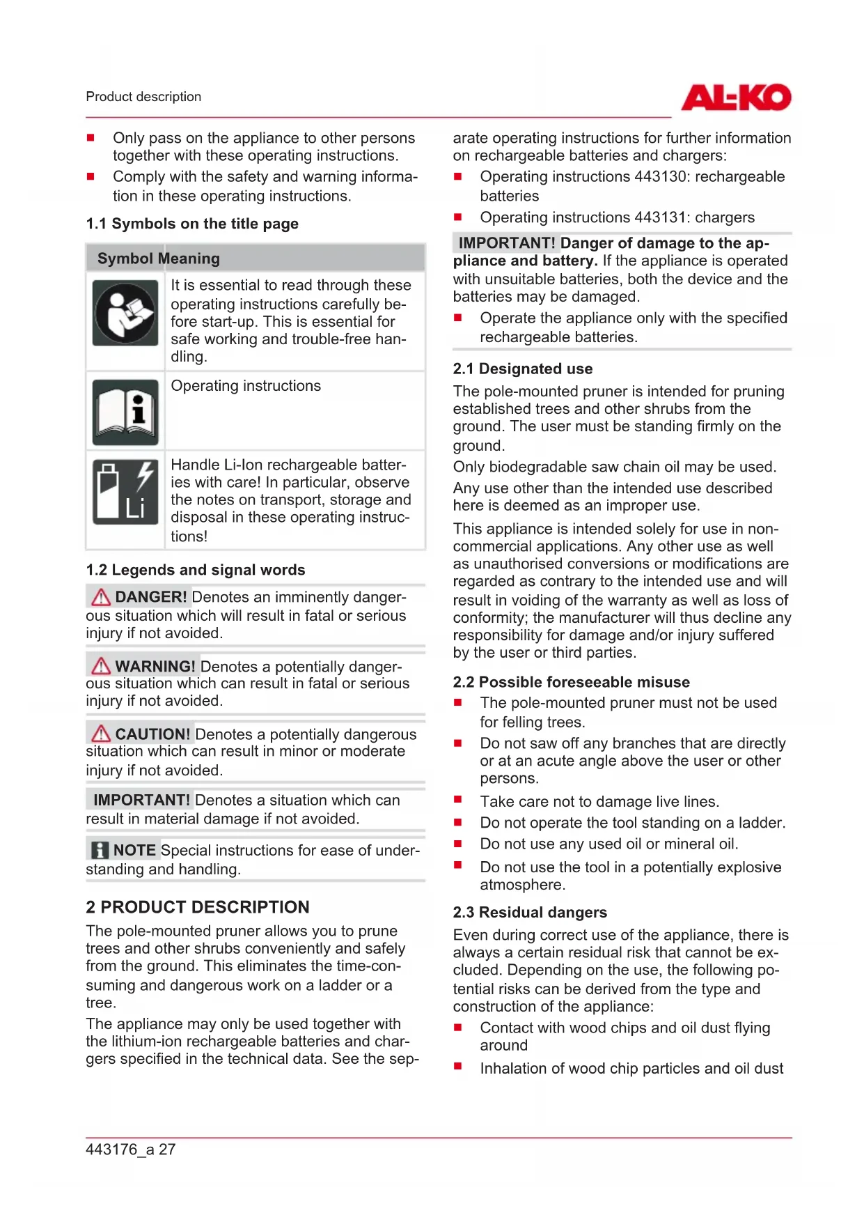 DANGER! Denotes an imminently danger- ous situation which will result in fatal or serious injury if not avoided. WARNING! Denotes a potentially danger- ous situation which can result in fatal or serious injury if not avoided. CAUTION! Denotes a potentially dangerous situation which can result in minor or moderate injury if not avoided. IMPORTANT! Denotes a situation which can result in material damage if not avoided. NOTE Special instructions for ease of under- standing and handling. 2 PRODUCT DESCRIPTION The pole-mounted pruner allows you to prune trees and other shrubs conveniently and safely from the ground. This eliminates the time-con- suming and dangerous work on a ladder or a tree. The appliance may only be used together with the lithium-ion rechargeable batteries and char- gers specified in the technical data. See the sep- arate operating instructions for further information on rechargeable batteries and chargers: