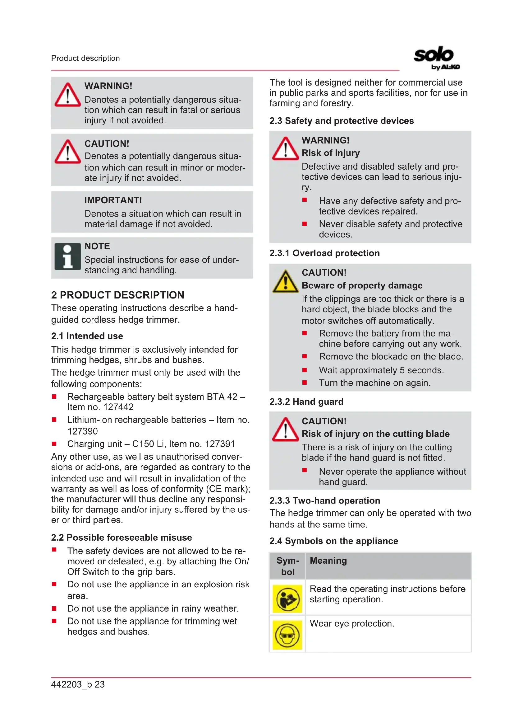 DANGER! Denotes an imminently dangerous situa- tion which will result in fatal or serious injury if not avoided.442203_b 23 Product description WARNING! Denotes a potentially dangerous situa- tion which can result in fatal or serious injury if not avoided. CAUTION! Denotes a potentially dangerous situa- tion which can result in minor or moder- ate injury if not avoided. IMPORTANT! Denotes a situation which can result in material damage if not avoided. NOTE Special instructions for ease of under- standing and handling. 2 PRODUCT DESCRIPTION These operating instructions describe a hand- guided cordless hedge trimmer.