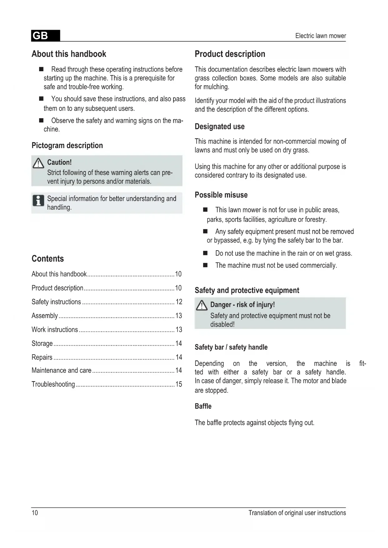 - Troubleshooting About this handbook Read through these operating instructions before starting up the machine. This is a prerequisite for safe and trouble-free working. You should save these instructions, and also pass them on to any subsequent users. Observe the safety and warning signs on the ma- chine. Pictogram description Caution! Strict following of these warning alerts can pre- vent injury to persons and/or materials. Special information for better understanding and handling. Product description This documentation describes electric lawn mowers with grass collection boxes. Some models are also suitable for mulching. Identify your model with the aid of the product illustrations and the description of the different options. Designated use This machine is intended for non-commercial mowing of lawns and must only be used on dry grass. Using this machine for any other or additional purpose is considered contrary to its designated use. Possible misuse This lawn mower is not for use in public areas, parks, sports facilities, agriculture or forestry. Any safety equipment present must not be removed or bypassed, e.g. by tying the safety bar to the bar. Do not use the machine in the rain or on wet grass. The machine must not be used commercially. Safety and protective equipment Danger - risk of injury! Safety and protective equipment must not be disabled! Safety bar / safety handle Depending on the version, the machine is t- ted with either a safety bar or a safety handle. In case of danger, simply release it. The motor and blade are stopped. Bafe Thebafeprotectsagainstobjectsyingout.GB p. 15