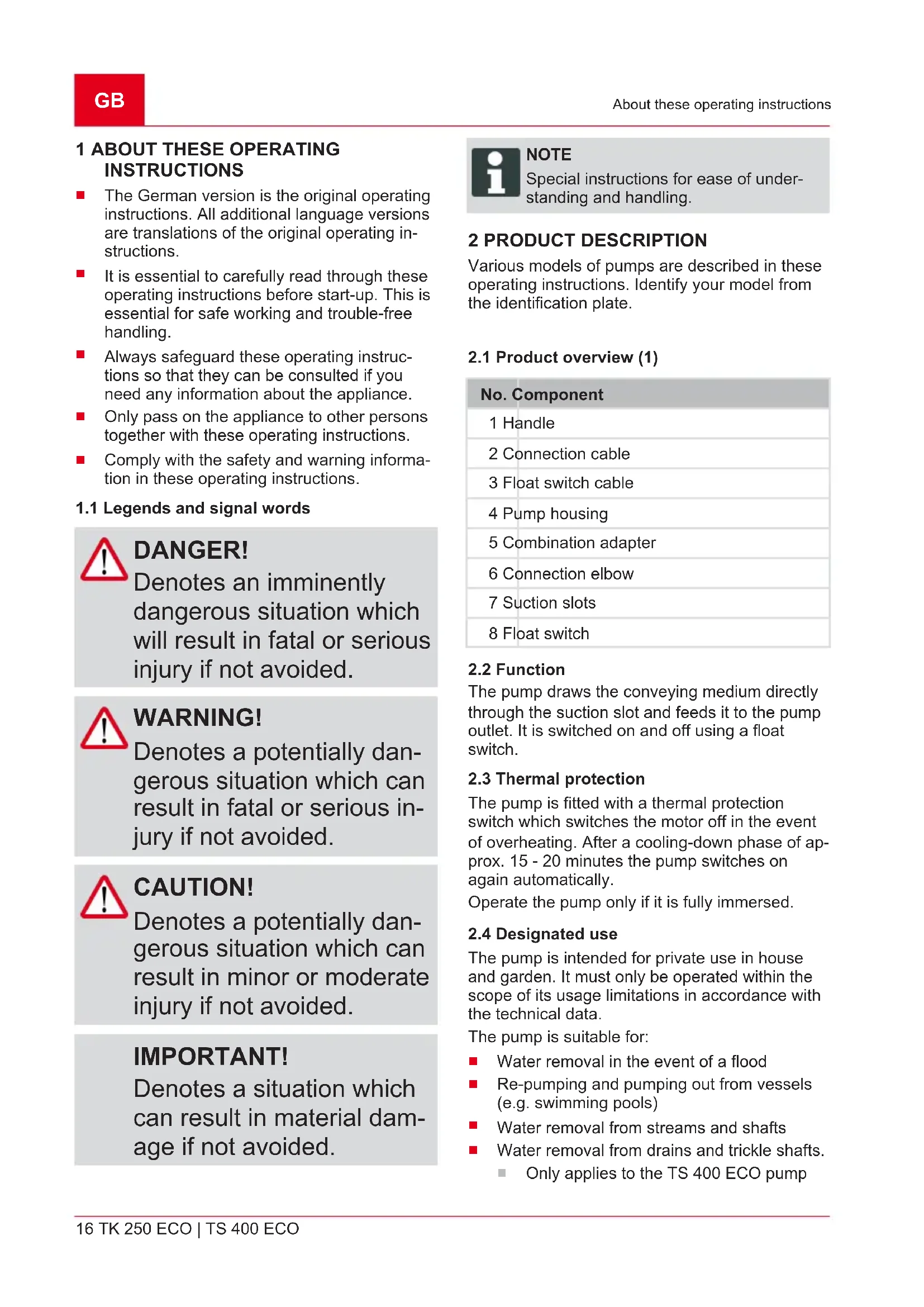 DANGER! Denotes an imminently dangerous situation which will result in fatal or serious injury if not avoided. WARNING! Denotes a potentially dan- gerous situation which can result in fatal or serious in- jury if not avoided. CAUTION! Denotes a potentially dan- gerous situation which can result in minor or moderate injury if not avoided. IMPORTANT! Denotes a situation which can result in material dam- age if not avoided. NOTE Special instructions for ease of under- standing and handling. 2 PRODUCT DESCRIPTION Various models of pumps are described in these operating instructions. Identify your model from the identification plate.