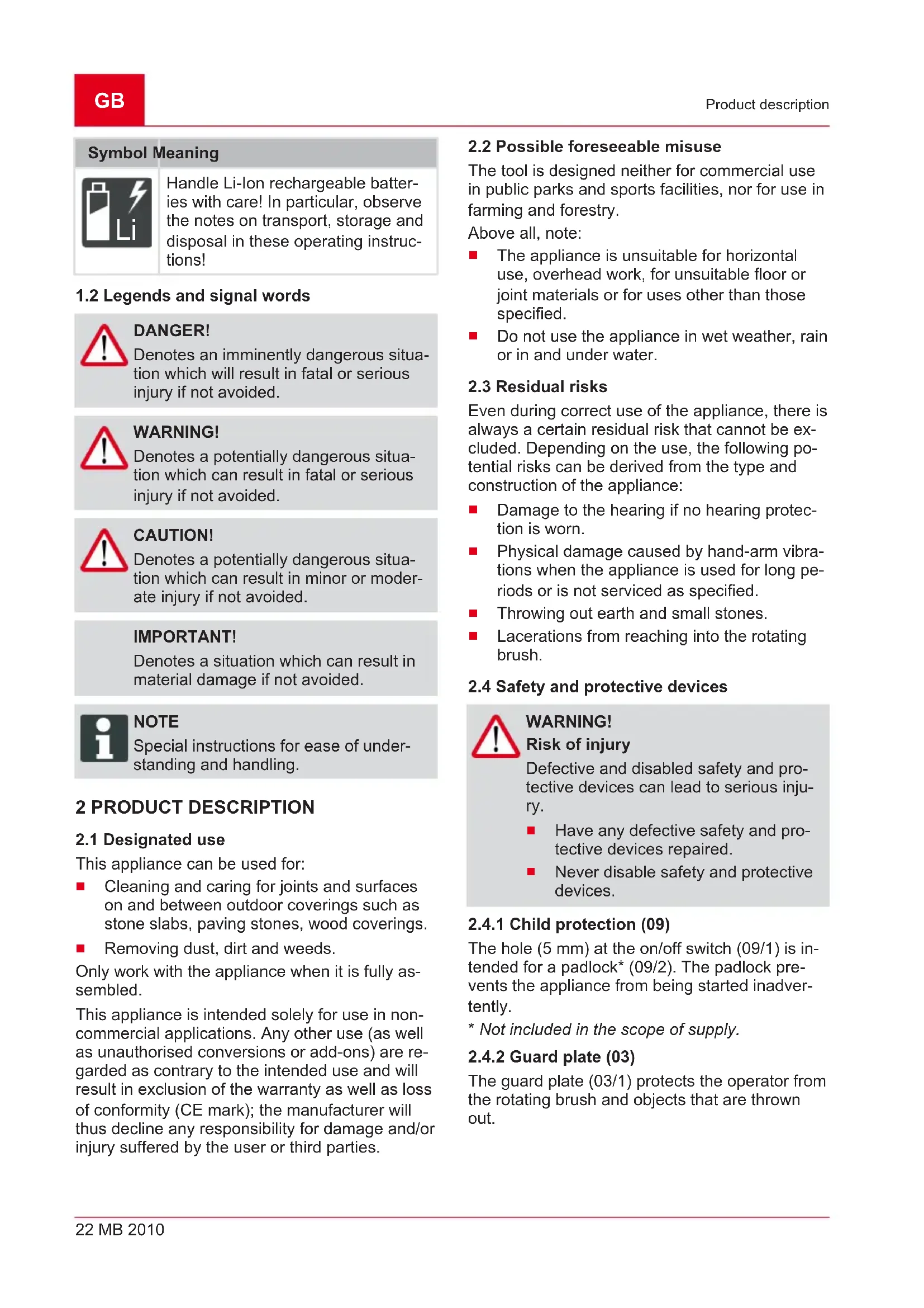 No. Component 1 Base unit 2 Guide handle 3 Telescopic handle 4 Guide wheel 5 Brush head, adjustable 6 Guard plate 7 2 screws 3.5 x 13 8 Nut M8 9 Wire brush 10 Nylon brush 11 Pin 12 Wrench 13 Operating instructions NOTE The rechargeable battery and charging unit are not included in the scope of de- livery and must therefore be purchased separately.GB 24 MB 2010 Safety instructions Available under the following part numbers are: