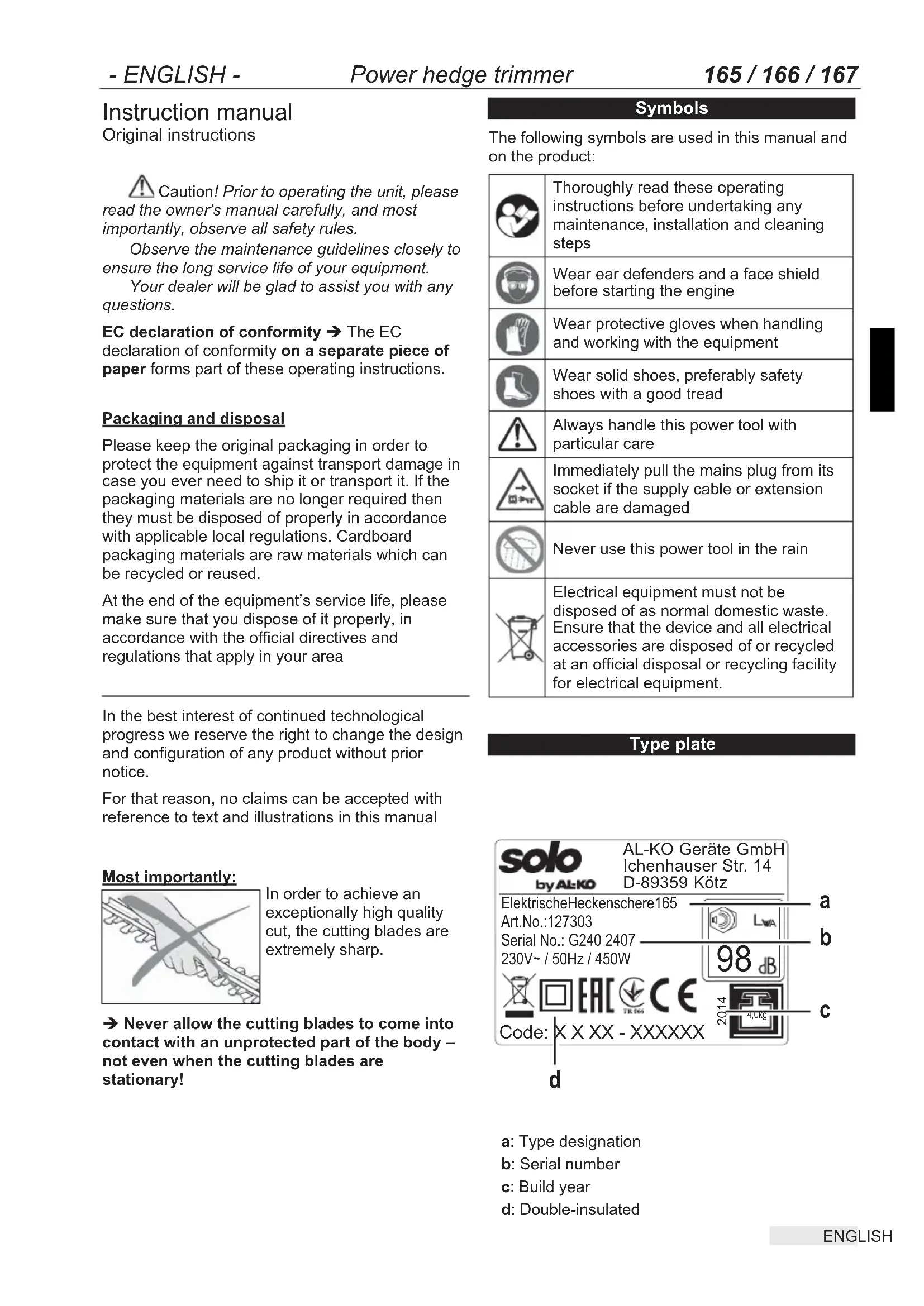 < 2,5 < 2,5 < 2,5 Schutzklasse II / DIN EN 50144 / VDE 0740- ENGLISH - Power hedge trimmer 165 / 166 / 167 ENGLISH 1 Instruction manual Original instructions Caution! Prior to operating the unit, please read the owner’s manual carefully, and most importantly, observe all safety rules. Observe the maintenance guidelines closely to ensure the long service life of your equipment. Your dealer will be glad to assist you with any questions. EC declaration of conformity Î The EC declaration of conformity on a separate piece of paper forms part of these operating instructions. Packaging and disposal Please keep the original packaging in order to protect the equipment against transport damage in case you ever need to ship it or transport it. If the packaging materials are no longer required then they must be disposed of properly in accordance with applicable local regulations. Cardboard packaging materials are raw materials which can be recycled or reused. At the end of the equipment’s service life, please make sure that you dispose of it properly, in accordance with the official directives and regulations that apply in your area
