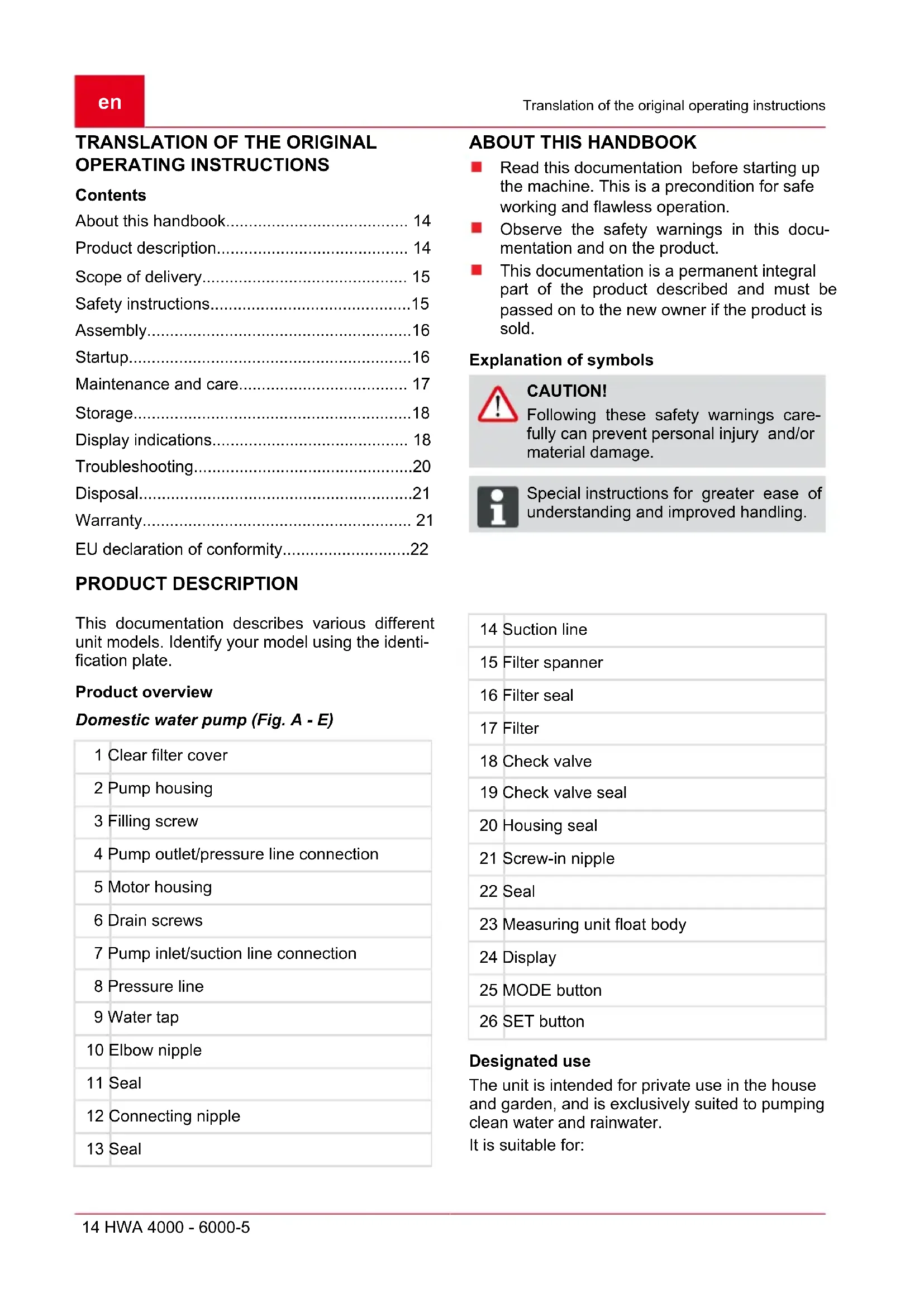 Read this documentation before starting up the machine. This is a precondition for safe working and flawless operation. Observe the safety warnings in this docu- mentation and on the product. This documentation is a permanent integral part of the product described and must be passed on to the new owner if the product is sold. Explanation of symbols CAUTION! Following these safety warnings care- fully can prevent personal injury and/or material damage. ADVICE Special instructions for greater ease of understanding and improved handling. PRODUCT DESCRIPTION This documentation describes various different unit models. Identify your model using the identi- fication plate. Product overview Domestic water pump (Fig. A - E) 1 Clear filter cover 2 Pump housing 3 Filling screw 4 Pump outlet/pressure line connection 5 Motor housing 6 Drain screws 7 Pump inlet/suction line connection 8 Pressure line 9 Water tap 10 Elbow nipple 11 Seal 12 Connecting nipple 13 Seal 14 Suction line 15 Filter spanner 16 Filter seal 17 Filter 18 Check valve 19 Check valve seal 20 Housing seal 21 Screw-in nipple 22 Seal 23 Measuring unit float body 24 Display 25 MODE button 26 SET button Designated use The unit is intended for private use in the house and garden, and is exclusively suited to pumping clean water and rainwater. It is suitable for:Product description 477296_c 15 Watering the garden and premises Water supply in the house Pressure increase in the water supply. ADVICE If the pressure of the water supply is in- creased, the local regulations must be observed. Your sanitation expert will pro- vide the necessary information. Possible misuse The house water system is not suitable for the conveying: Water containing sand, salt water and waste water with textile and paper content Aggressive, corrosive, explosive or fuming chemicals or liquids Fluids above 35°C. ADVICE The unit is not allowed to be used for pumping water for use in food or bever- ages. The unit is not suitable for continuous use.