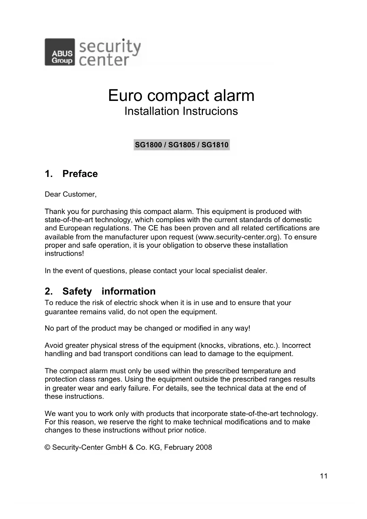 To reduce the risk of electric shock when it is in use and to ensure that your guarantee remains valid, do not open the equipment. No part of the product may be changed or modified in any way! Avoid greater physical stress of the equipment (knocks, vibrations, etc.). Incorrect handling and bad transport conditions can lead to damage to the equipment. The compact alarm must only be used within the prescribed temperature and protection class ranges. Using the equipment outside the prescribed ranges results in greater wear and early failure. For details, see the technical data at the end of these instructions. We want you to work only with products that incorporate state-of-the-art technology. For this reason, we reserve the right to make technical modifications and to make changes to these instructions without prior notice. © Security-Center GmbH & Co. KG, February 2008 Euro compact alarm Installation Instrucions SG1800 / SG1805 / SG181012