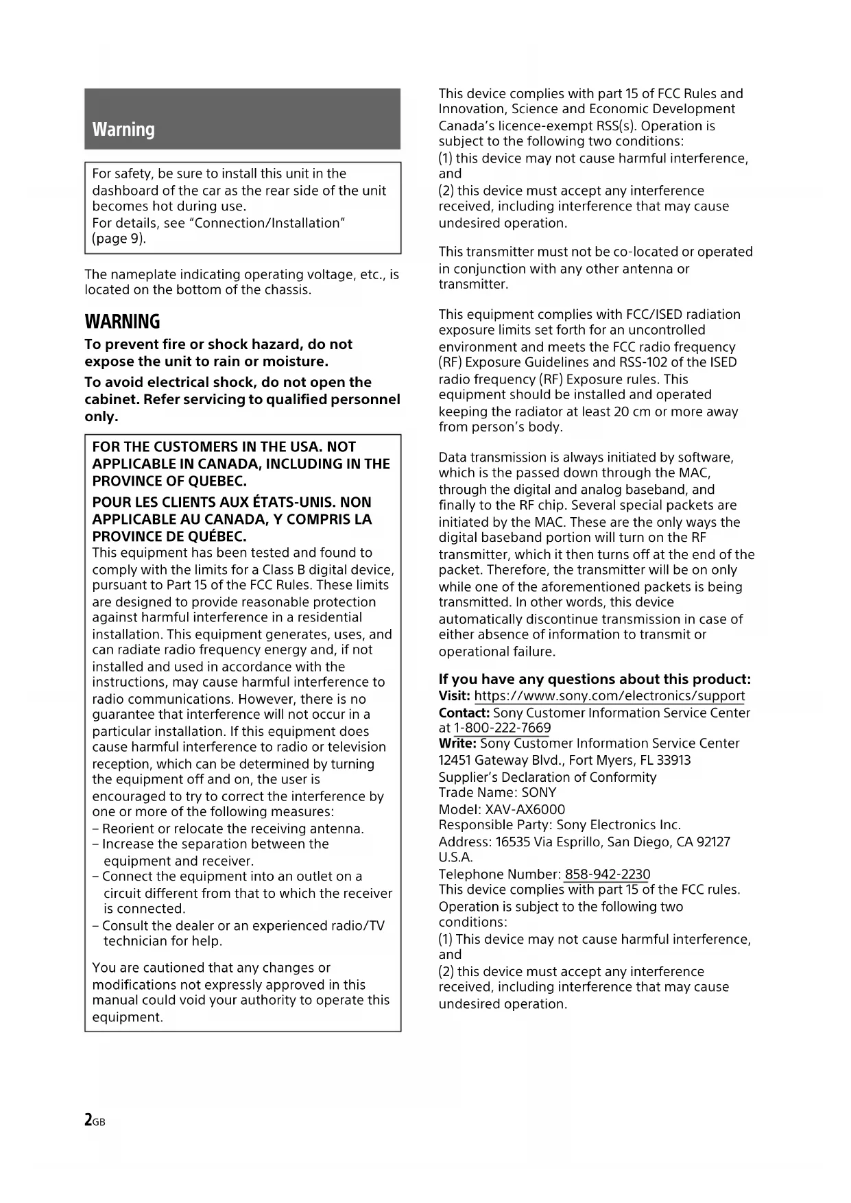 2 Please contact (U.S.A. only); Call 1-800-222-7669 URL https://www.SONY.com