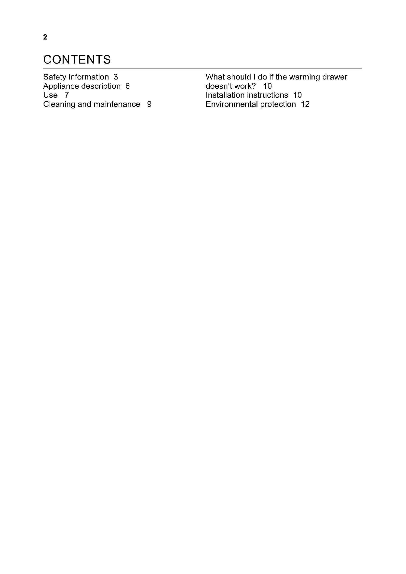- The on/off switch does not light up: – The switch indicator light has blown WHAT SHOULD I DO IF THE WARMING DRAWER DOE- SN’T WORK? INSTALLATION INSTRUCTIONS Before installation Check that the supply voltage indicated on the data plate is the same as that provided by the power socket you plan to use. Open the drawer, take out all the accesso- ries and remove the packaging material WARNING! The front surface of the warming drawer may be cove- red in a protective film. Carefully remove this film before using the warming drawer for the first time. Ensure that the warming drawer is not damaged in any way. Check that the drawer opens and closes correctly. If damage is encounte- red, inform Technical Assistance. WARNING! The power socket should be easily accessible after the warming drawer has been installed.11 The warming drawer should only be in- stalled in combination with the appliances specified by the manufacturer. If it is fitted in combination with other appliances, the guarantee will be void since it is impossi- ble to guarantee that the warming drawer will work correctly. Installation WARNING! Refer to the installa- tion instructions supplied separa- tely. Installing the warming drawer in combination with another applian- ce requires be a fixed intermediate shelf in the carcase to support the weight of both appliances. The appliance to be installed in combination with the warming drawer will be installed directly on top of it. Follow the instructions given in the corresponding instruction and installation booklet for installation of the combined appliance. Electrical connection Electrical installation must be performed by a qualified electrician. Before connecting the warming drawer to the mains electricity supply, check that the voltage and frequency of the mains supply matches that shown on the data plate inside the appliance. The electrical connection should be made via an omnipolar switch rated for the cur- rent capacity with minimum 3 mm contact separation, in order to provide isolation in emergencies or when cleaning the war- ming drawer. The connection must be suitably earthed. WARNING! The warming drawer must be earthed. If the appliance flex requires replacement, contact Technical As- sistance or an authorised service centre, as specialised tools are required. The manufacturer and retailer do not accept responsibility for any injury to people or animals or damage to personal property as a result of failure to follow the sup- plied installation instructions.12 .Recycle materials with the following symbol. Place the packaging in the corresponding containers for recycling. Help protect the environment and human health and to recycle waste from electrical and electronic appliances. Do not dispose of appliances marked with the following symbol with general household waste. Take the product to your local recycling facility or contact your local council ENVIRONMENTAL PROTECTION13 Informationen zur sicherheit 14 Gerätebeschreibung 17 Bedienung 18 Reinigung und pflege 20 Was ist im falle einer funktionsstörung zu tun? 21 Installationsanleitung 21 Umwelt- und gesundheitsschutz 23 INHALTSVERZEICHNIS14