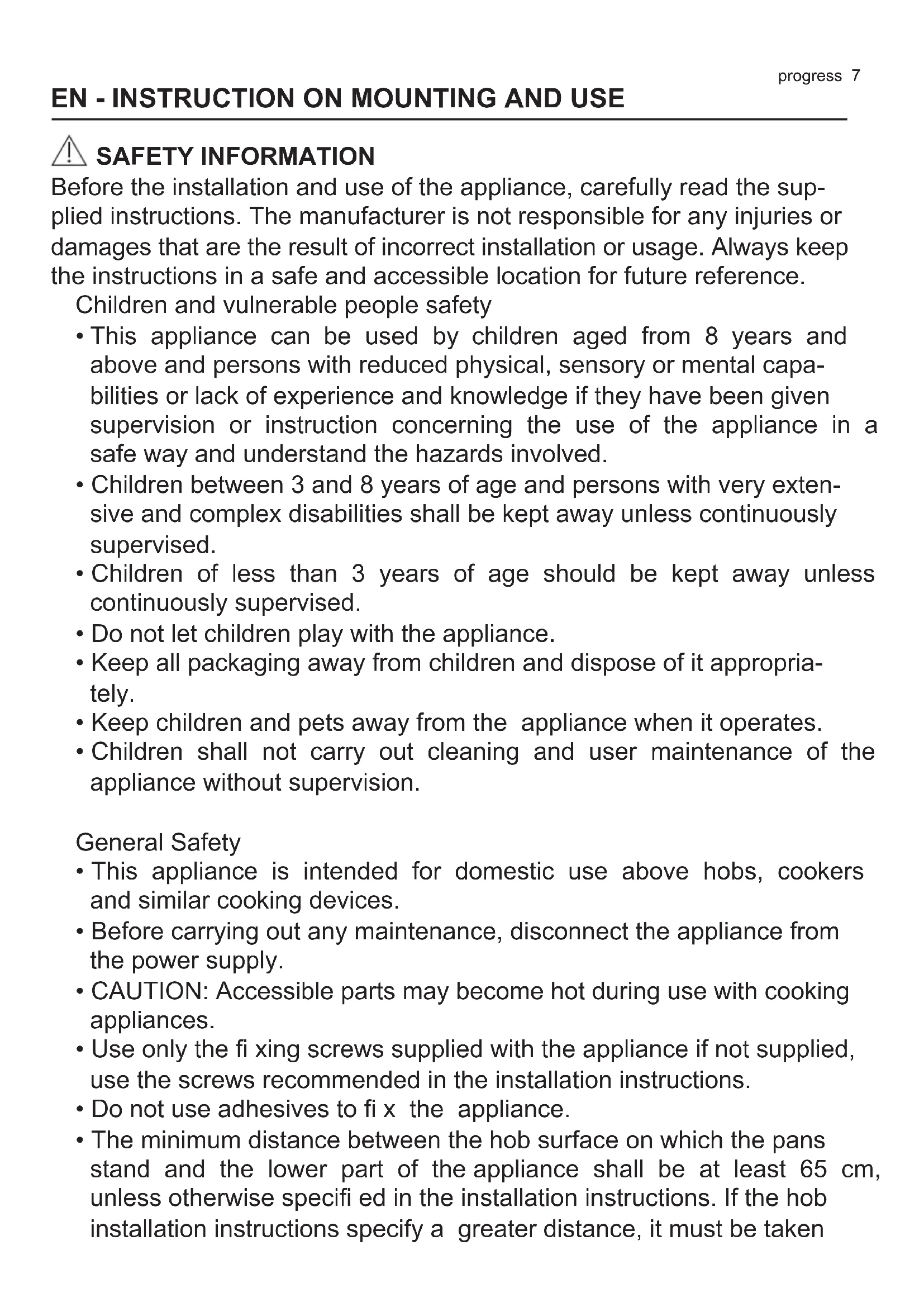 - The minimum distance between the hob surface on which the pans stand and the lower part of the appliance shall be at least 65 cm, unless otherwise specifi ed in the installation instructions. If the hob installation instructions specify a greater distance, it must be taken8 progress into account.