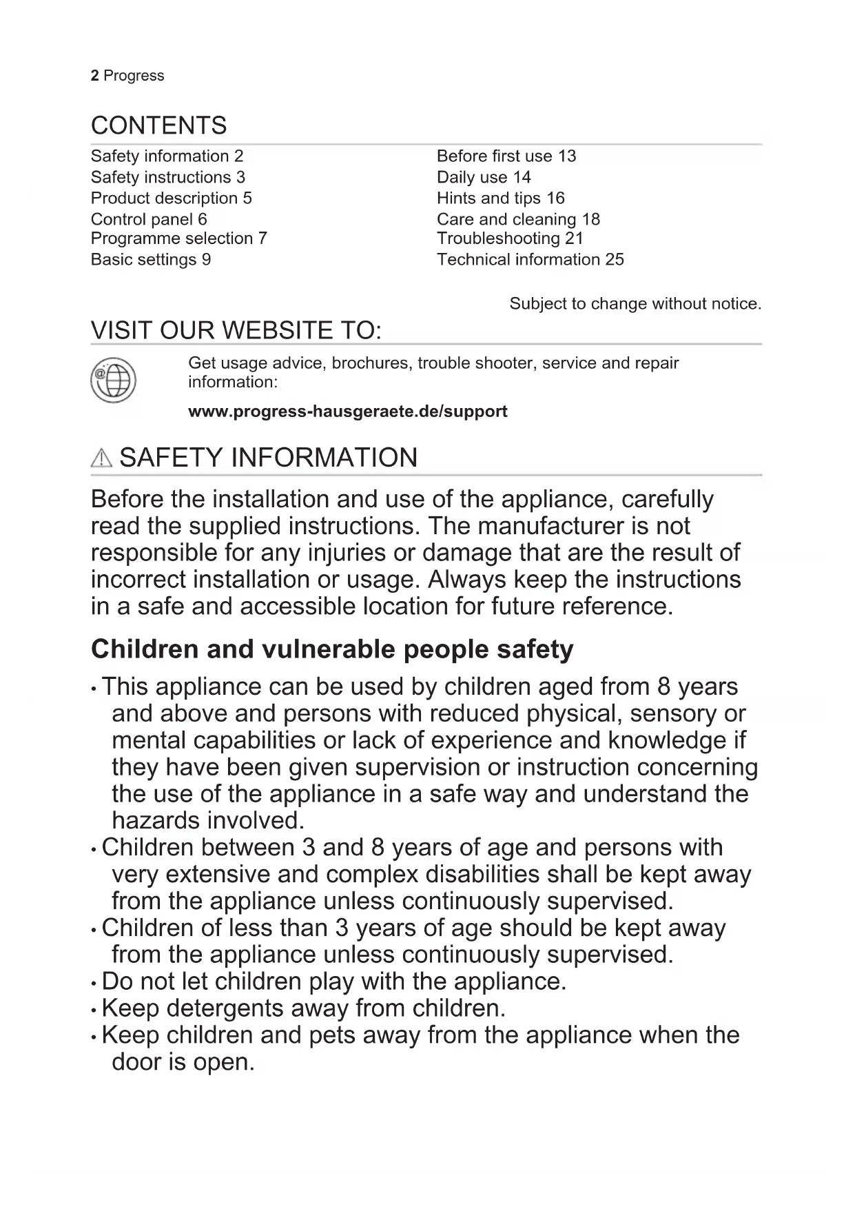 - Keep children and pets away from the appliance when the door is open. 2 Progress• Children shall not carry out cleaning and user maintenance of the appliance without supervision. General Safety