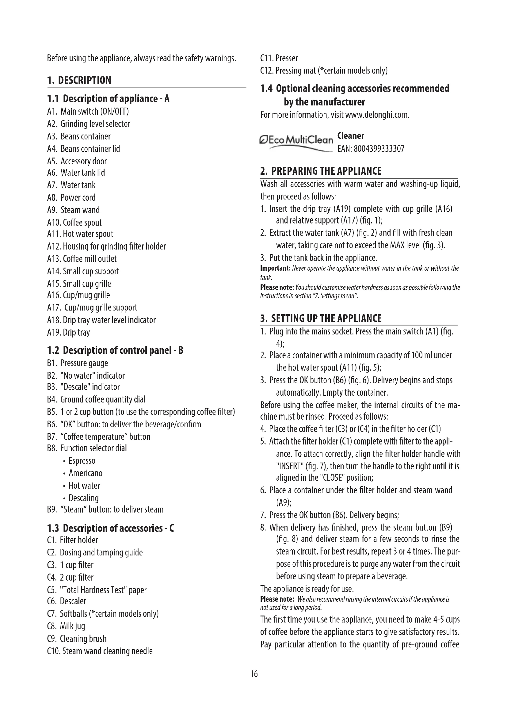 by the manufacturer For more information, visit www.delonghi.com. Cleaner EAN: 8004399333307