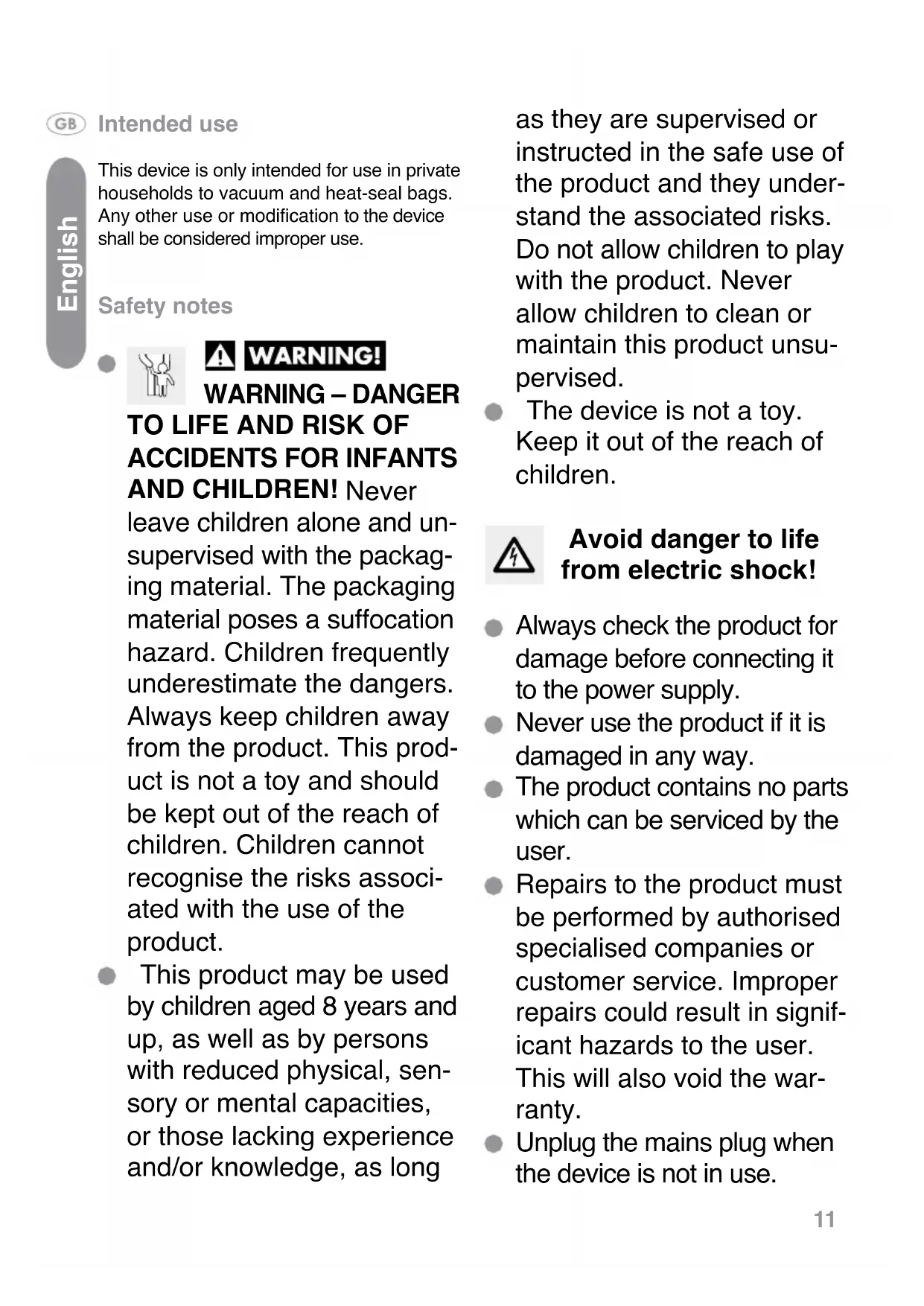 Deutsch11 Intended use This device is only intended for use in private households to vacuum and heat-seal bags. Any other use or modification to the device shall be considered improper use. Safety notes