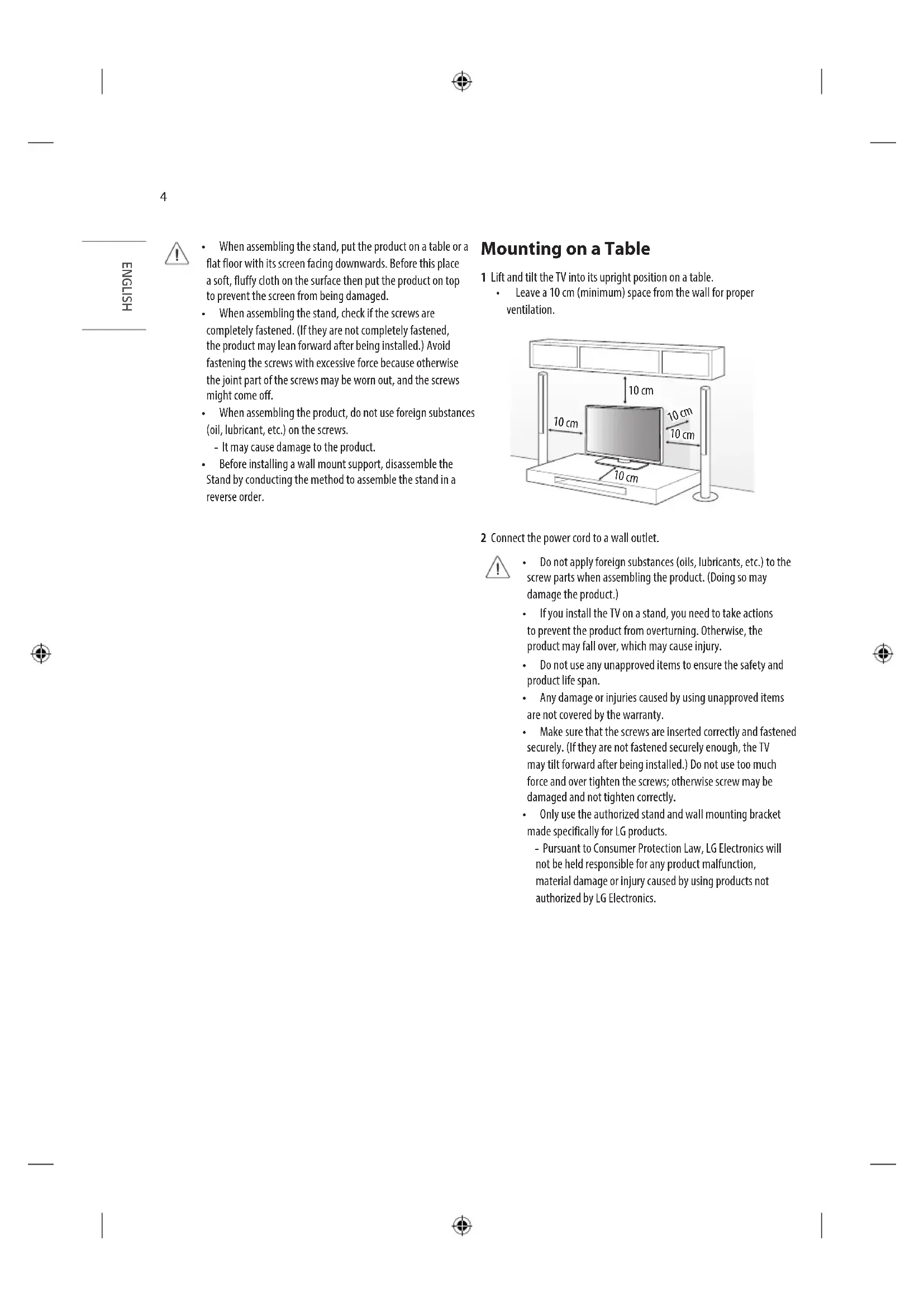 - Only use the authorized stand and wall mounting bracket made specifically for LG products. - Pursuant to Consumer Protection Law, LG Electronics will not be held responsible for any product malfunction, material damage or injury caused by using products not authorized by LG Electronics.5 ENGLISH Attaching the TV to a Desk (Depending on model)