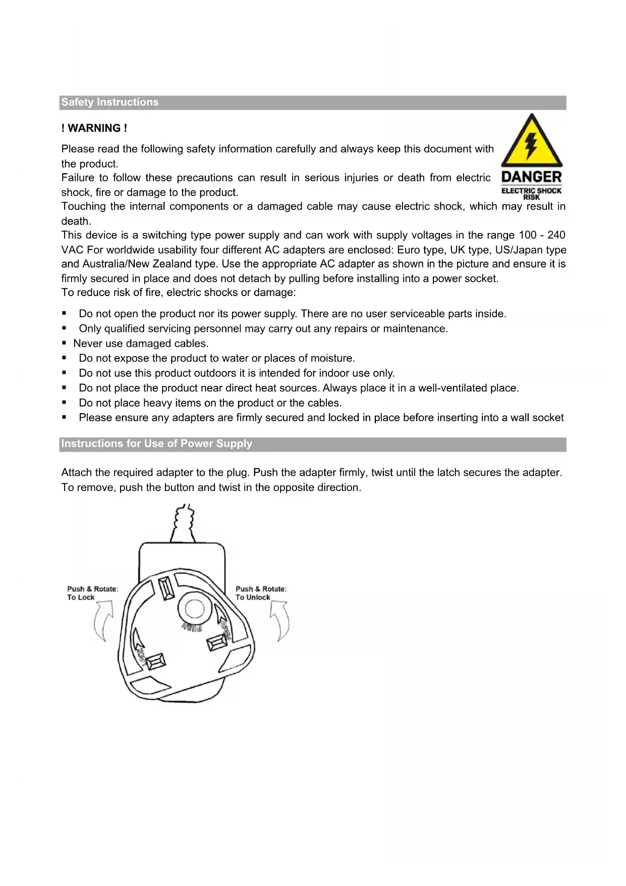No. 38262 lindy.comSafety Instructions ! WARNING ! Please read the following safety information carefully and always keep this document with the product. Failure to follow these precautions can result in serious injuries or death from electric shock, fire or damage to the product. Touching the internal components or a damaged cable may cause electric shock, which may result in death. This device is a switching type power supply and can work with supply voltages in the range 100 - 240 VAC For worldwide usability four different AC adapters are enclosed: Euro type, UK type, US/Japan type and Australia/New Zealand type. Use the appropriate AC adapter as shown in the picture and ensure it is firmly secured in place and does not detach by pulling before installing into a power socket. To reduce risk of fire, electric shocks or damage: Do not open the product nor its power supply. There are no user serviceable parts inside. Only qualified servicing personnel may carry out any repairs or maintenance. Never use damaged cables. Do not expose the product to water or places of moisture. Do not use this product outdoors it is intended for indoor use only. Do not place the product near direct heat sources. Always place it in a well-ventilated place. Do not place heavy items on the product or the cables. Please ensure any adapters are firmly secured and locked in place before inserting into a wall socket Instructions for Use of Power Supply Attach the required adapter to the plug. Push the adapter firmly, twist until the latch secures the adapter. To remove, push the button and twist in the opposite direction.User Manual English Introduction Thank you for purchasing the 70m Cat.6 4 Port HDMI 4K60 Splitter Extender. This product has been designed to provide trouble free, reliable operation. It benefits from both a LINDY 2-year warranty and free lifetime technical support. To ensure correct use, please read this manual carefully and retain it for future reference. Package Contents 70m Cat.6 4 Port HDMI 4K60 Splitter Extender 4 x Cat.6 HDMI Receivers IR Emitter Cable, 1.2m 4 x IR Receiver Cable, 1.2m 2 x Transmitter Mounting Brackets & Screws 8 x Receiver Mounting Brackets & Screws 12VDC 2A Multi-country Power Supply (UK, EU, US & AUS), Barrel Size: 5.5/2.1mm Lindy Manual Features Distribute HDMI signals to up to 4 displays in multiple locations. Supports resolutions up to 4K@60Hz, with additional support for HDR. Features a loop-through HDMI output on the transmitter for local monitoring or cascading up to 3 levels for larger installs. Control using an IR remote from the receiver locations. Supports Power over Cat.6 (PoC) to the receivers, only a single power supply is required for operation. Specification Interface Standard: HDMI 2.0 Supported Bandwidth: 18Gbps Maximum Distance: 70m (229.66ft) Maximum Resolution: 3840x2160@60Hz 4:4:4 8bit HDCP Support: 2.2 EDID Pass-through Supported Audio Formats: 2CH, up to 5.1 copying EDID from loop out port IR Support: 20-60KHz Chipset: GSV2006 & GSV5100 Housing Material: Metal Operating Temperature: 0°C - 50°C (32°F - 122°F) Storage Temperature: -10°C - 80°C (14°F - 176°F) Humidity: 5 - 90% RH (non-condensing) Power Consumption: Splitter Extender: 5.2W, Receiver: 1.6W Colour: Black Connectors Transmitter Input: HDMI Type A (Female) Transmitter Output: 4 x RJ-45 (Female), HDMI Type A (Female), 3.5mm IR (Female) Receiver Input: RJ-45 (Female), 3.5mm IR (Female) Receiver Output: HDMI Type A (Female)User Manual English Product Overview Extender Splitter, Transmitter 12VDC: Connect and secure the included power supply. IR Out: Transmit IR control to the connected display using the included IR emitter cable. HDMI In: Connect to an HDMI source device using HDMI cable. HDMI Out: Connect to a local HDMI display, or alternatively connect up to 2 further 38262 units for larger scale distribution. Cat Out 1-4: Connect to the receiver units using Cat.6 or above cable. Reset Push Button: Press once to reset the system and all connections. Power LED: Indicates power of the transmitter. Power Switch: Push to manually switch the system on or off. Receiver