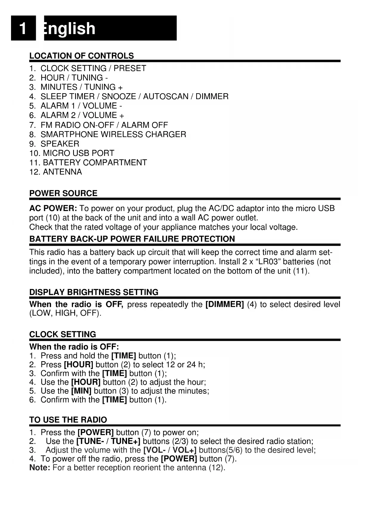 This radio has a battery back up circuit that will keep the correct time and alarm set- tings in the event of a temporary power interruption. Install 2 x “LR03” batteries (not included), into the battery compartment located on the bottom of the unit (11).
