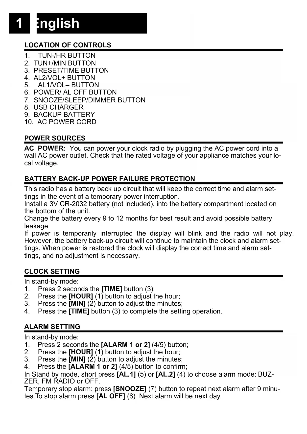 To prevent fire or shock hazard, do not allow this clock radio to be exposed to rain or moisture. This clock radio should not be exposed to direct sunlight, very high or low tempera- ture, moisture, vibration, or placed in a dusty environment. Do not use abrasives, benzine, thinners, or other solvents to clean the surfaces of the clock radio. To clean it, wipe with a mild non-abrasive defergent solution on a clean soft cloth. Never attempt to insert wires, pins, or other objects into the venlilation holes or ope-3 English nings on the clock radio. Note: When setting the Clock or Alarm times remember that this clock radio has a 24 Hour clock mode. TECNICAL SPECIFICATIONS Power Supply: AC 240V ~ 50Hz. Battery Backup 1X CR2032 (not included) Radio Frequency Coverage FM: 87.5 - 108 MHz. General Output Power: 1 x 0.5 Wrms. USB charging 5V 1A output max Specifications and design are subject to possible modifications without notice due to improvement. This marking shown on the product or its literature, indicates that it should not be disposed with other house-hold wastes at the end of its working life. To prevent possible harm to the environment or human health from uncontrolled waste disposal, please separate this from other types of wastes and recycle it responsibly to promote the sustainable reuse of material resources. Household users should contact the retailer where they purchased this product, or their local government office, for details of where and how they can take this item for environmentally safe recycling. Business users should contact their supplier and check the terms and con- ditions of the purchase contract. This product should not be mixed with other commercial wastes for disposal.