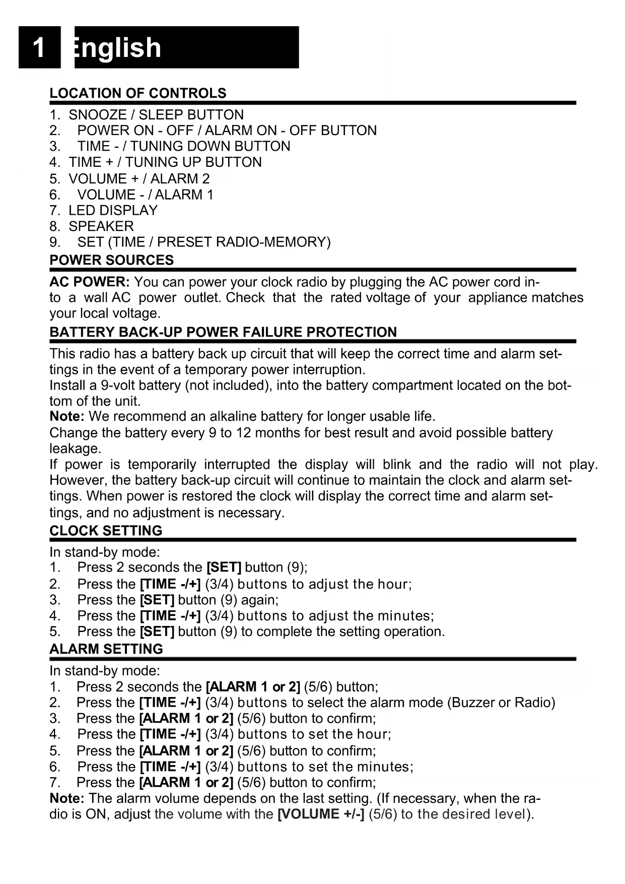 Note: The alarm volume depends on the last setting. (If necessary, when the ra- dio is ON, adjust the volume with the [VOLUME +/-] (5/6) to the desired level).2 English ALARM OFF: During Alarm on, press [POWER] button (2) to deactivate the alarm sound (the Alarm setting remains) or press [SNOOZE] button (1) to postpone the alarm for 9 min. To activate or deactivate the alarm, in stand-by mode, press the [ALARM 1 or 2] (5/6) button (When the alarm is ON, the “ ” indicator will light up on the right or left side of the display).