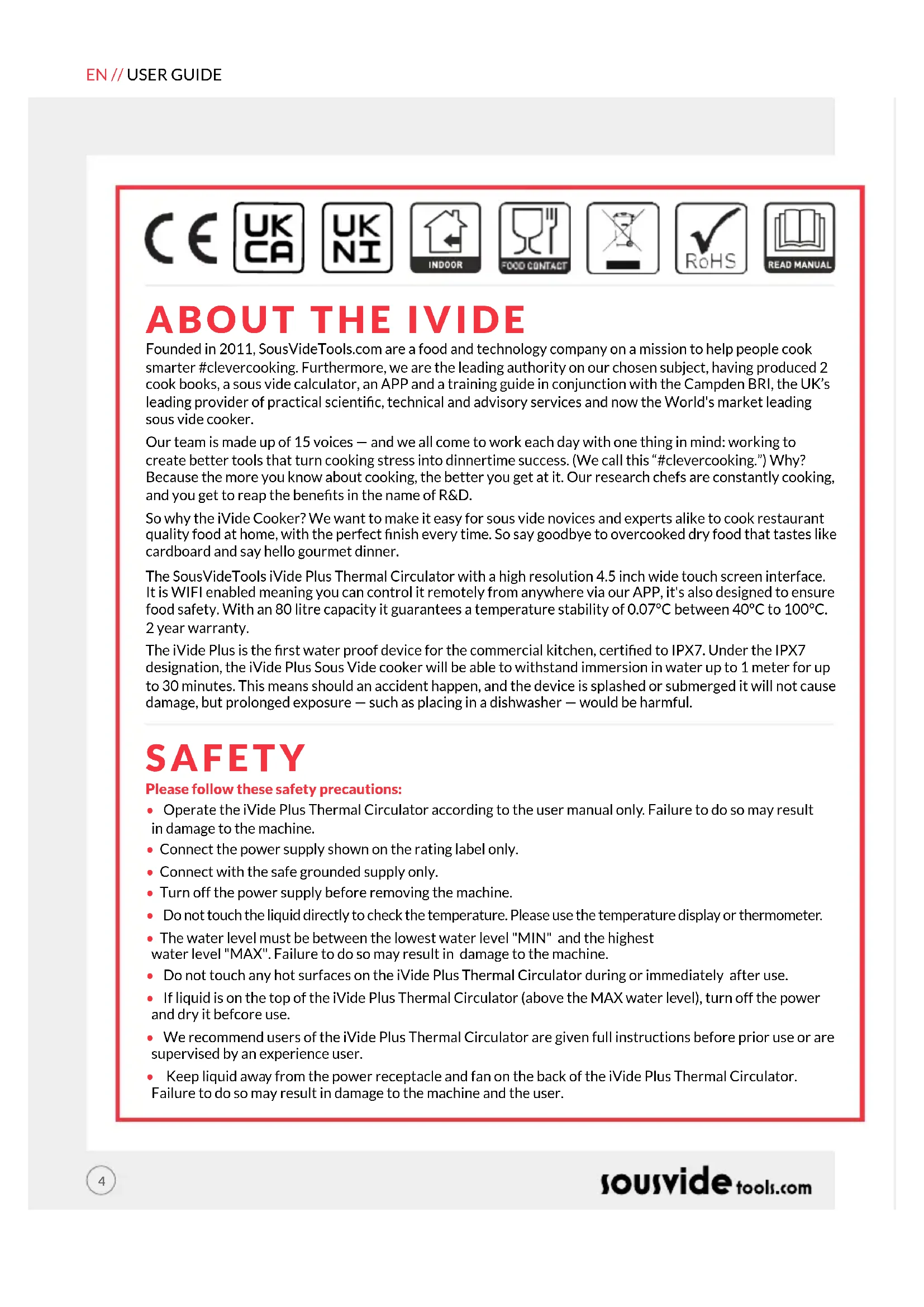 SAFETY Founded in 2011, SousVideTools.com are a food and technology company on a mission to help people cook smarter #clevercooking. Furthermore, we are the leading authority on our chosen subject, having produced 2 cook books, a sous vide calculator, an APP and a training guide in conjunction with the Campden BRI, the UK’s leading provider of practical scientic, technical and advisory services and now the World's market leading sous vide cooker. Our team is made up of 15 voices — and we all come to work each day with one thing in mind: working to create better tools that turn cooking stress into dinnertime success. (We call this “#clevercooking.”) Why? Because the more you know about cooking, the better you get at it. Our research chefs are constantly cooking, and you get to reap the benets in the name of R&D. So why the iVide Cooker? We want to make it easy for sous vide novices and experts alike to cook restaurant quality food at home, with the perfect nish every time. So say goodbye to overcooked dry food that tastes like cardboard and say hello gourmet dinner. The SousVideTools iVide Plus Thermal Circulator with a high resolution 4.5 inch wide touch screen interface. It is WIFI enabled meaning you can control it remotely from anywhere via our APP, it's also designed to ensure food safety. With an 80 litre capacity it guarantees a temperature stability of 0.07°C between 40°C to 100°C. 2 year warranty. The iVide Plus is the rst water proof device for the commercial kitchen, certied to IPX7. Under the IPX7 designation, the iVide Plus Sous Vide cooker will be able to withstand immersion in water up to 1 meter for up to 30 minutes. This means should an accident happen, and the device is splashed or submerged it will not cause damage, but prolonged exposure — such as placing in a dishwasher — would be harmful. Please follow these safety precautions: