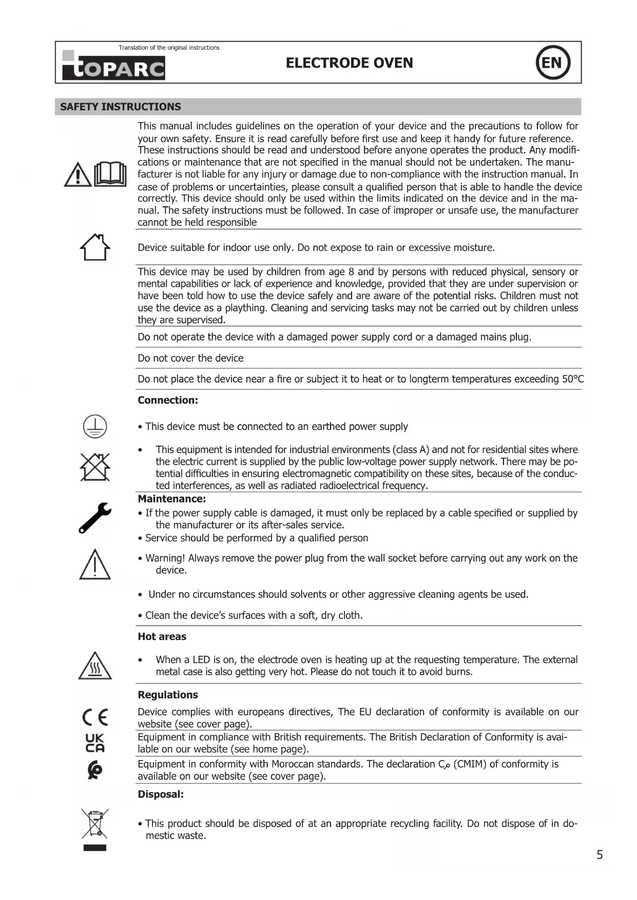 - When a LED is on, the electrode oven is heating up at the requesting temperature. The external metal case is also getting very hot. Please do not touch it to avoid burns. Regulations Device complies with europeans directives, The EU declaration of conformity is available on our website (see cover page). Equipment in compliance with British requirements. The British Declaration of Conformity is avai- lable on our website (see home page). Equipment in conformity with Moroccan standards. The declaration Cم (CMIM) of conformity is available on our website (see cover page). Disposal: