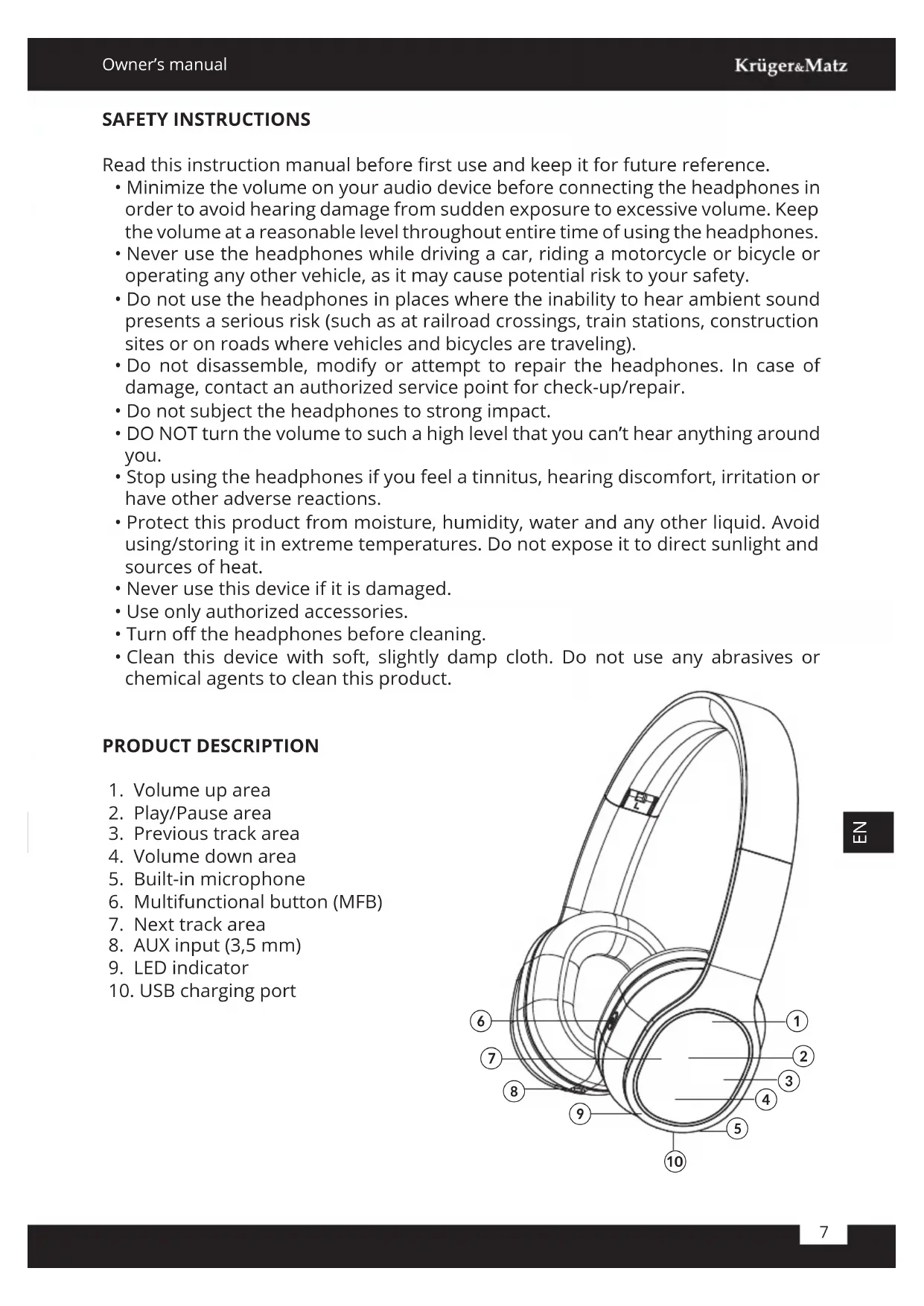 English Correct Disposal of This Product (Waste Electrical & Electronic Equipment) (Applicable in the European Union and other European countries with separate collection systems) This marking shown on the product or Its literature, indicates that It should not be disposed with other household wastes at the end of its working life. To prevent possible harm lo the environment or human health from uncontrolled waste disposal, please separate this from other types of wastes and recycle it responsibly to promote the sustainable reuse of material resources. Household users should contact either the retailer where they purchased this product, or their local government oce, for details of where and how they can take this item for environmentally safe recycling. Business users should contact their supplier and check the terms and conditions of the purchase contract This product should not be mixed with other commercial wastes for disposal. Made in China for LECHPOL ELECTRONICS Sp. z o.o. Sp.k., ul. Garwolińska 1, 08-400 Miętne. LEARN MORE For more information on this product, go to www.krugermatz.com. Visit www.krugermatz.com website for more products and accessories. In case of any doubts or questions reach out to our Frequently Asked Questions section. Lechpol Electronics Sp. z o.o. Sp.k. hereby declares that wireless headphones KM0644/KM0645 is consistent with directive 2014/53/UE. Full text of the EU Declaration of Conformity is available at following Internet address: www.lechpol.eu.11 Mode d’emploi