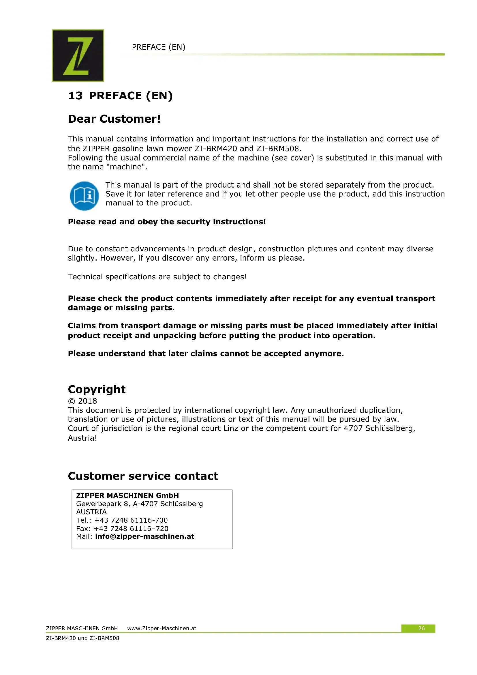 ZIPPER MASCHINEN GmbH Gewerbepark 8, A-4707 Schlüsslberg AUSTRIA Tel.: +43 7248 61116-700 Fax: +43 7248 61116–720 Mail: info@zipper-maschinen.atSAFETY ZIPPER MASCHINEN GmbH www.Zipper-Maschinen.at 27 ZI-BRM420 und ZI-BRM508 14 SAFETY This section contains information and important notices for safe commissioning and handling of machine. For your own safety, read these operating instructions carefully before putting the machine into operation. This will enable you to handle the machine safely and prevent misunderstandings as well as possible damage to property and persons. Also observe the symbols and pictograms used as well as the safety instructions and hazard warnings! Intended use of the machine The machine is intended exclusively for the following activities: For mowing and mulching lawns within the specified application limits. ZIPPER-MASCHINEN assumes no responsibility or warranty for any other use or use beyond this and for any resulting damage to property or injury.